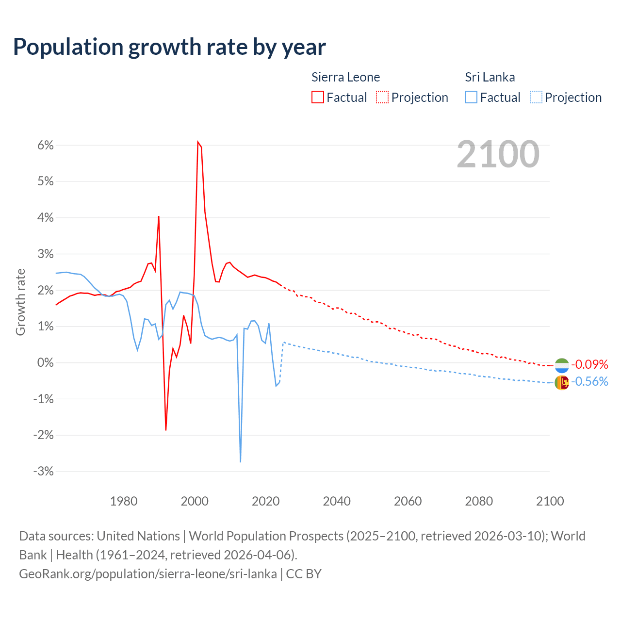 - For the last 10 years, Sierra Leone has had an average growth rate of +2.32% per year vs +0.57% in Sri Lanka.