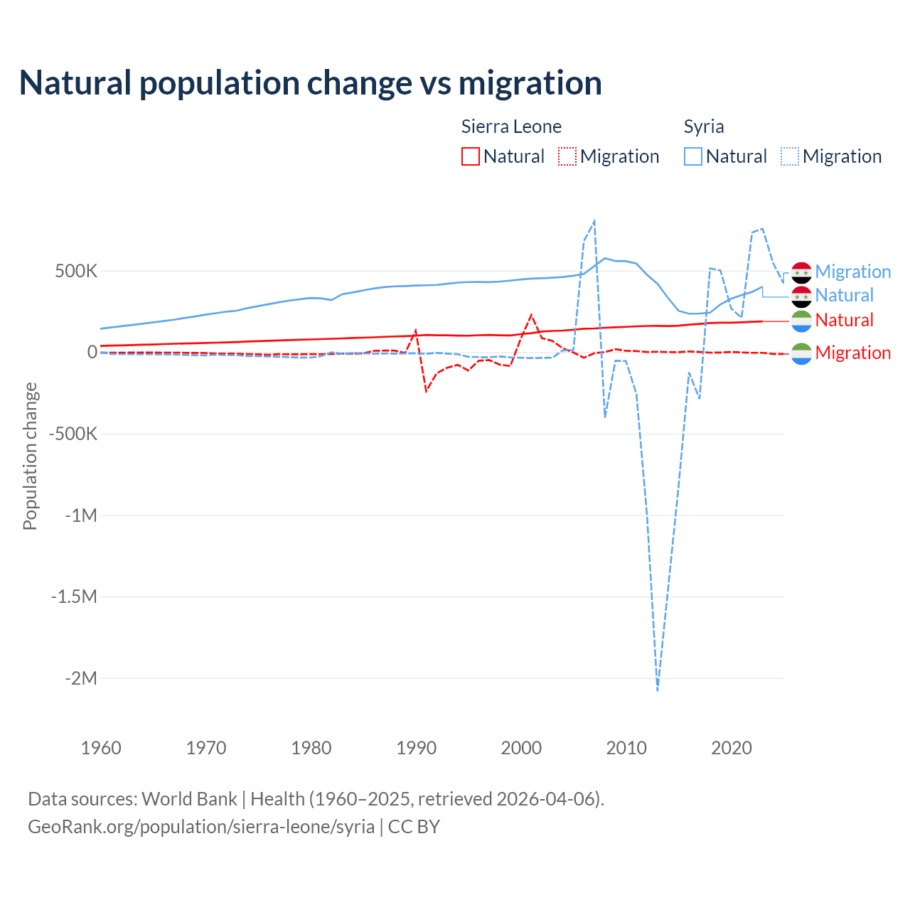 Over the last 10 years, 99.6% of the population change in Sierra Leone is from natural causes (a gain of 1,764,049 people) and 0.41% is from migration (a loss of 7,211 people). In Syria 91.3% is from natural causes (a gain of 3,047,621 people) and 8.72% is from migration (a gain of 291,069 people).