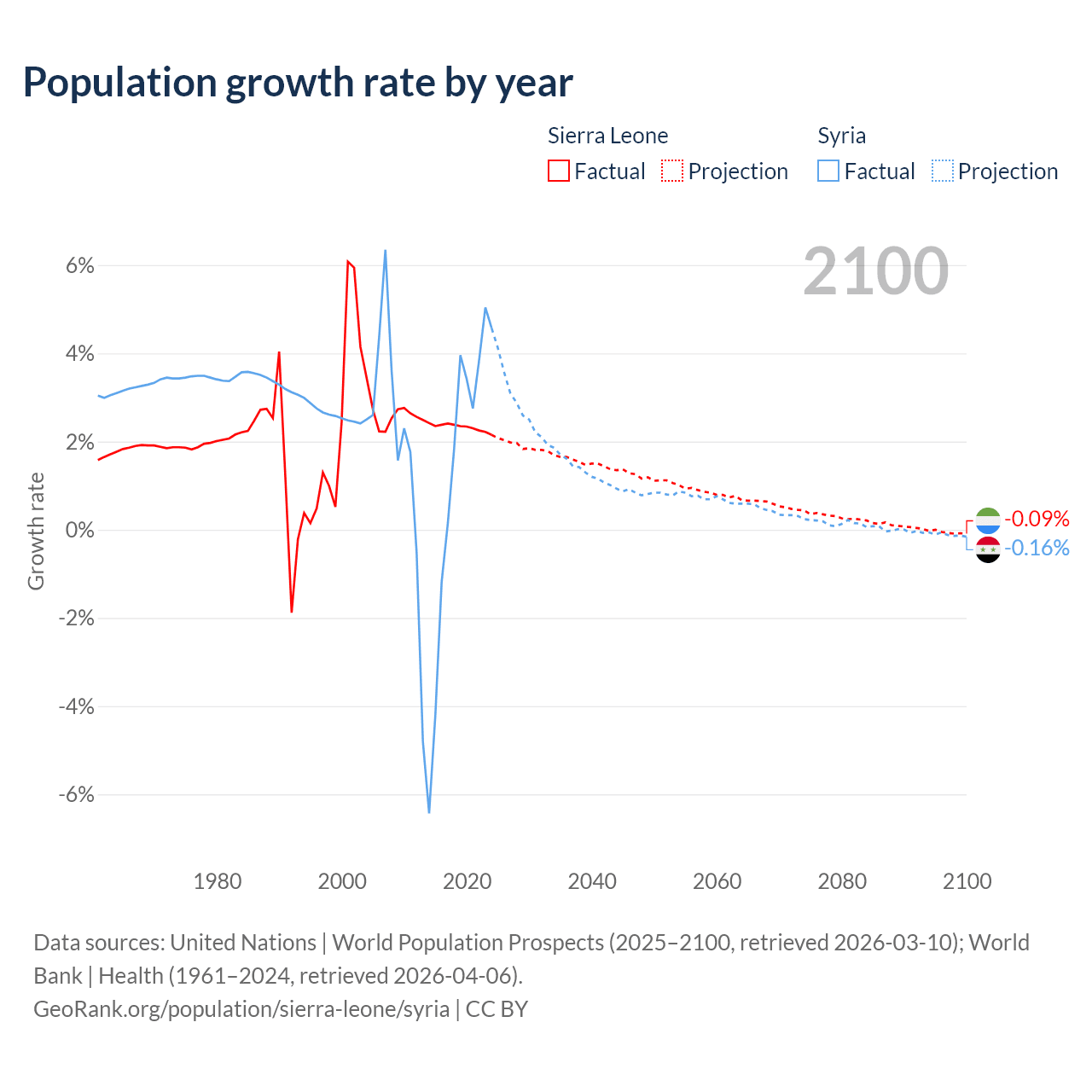 - For the last 10 years, Sierra Leone has had an average growth rate of +2.32% per year vs +1.25% in Syria.