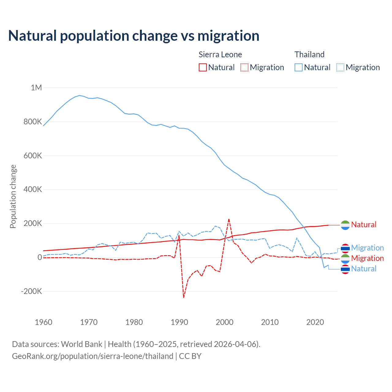 Over the last 10 years, 99.6% of the population change in Sierra Leone is from natural causes (a gain of 1,764,049 people) and 0.41% is from migration (a loss of 7,211 people). In Thailand 78.4% is from natural causes (a gain of 1,292,528 people) and 21.6% is from migration (a gain of 355,361 people).