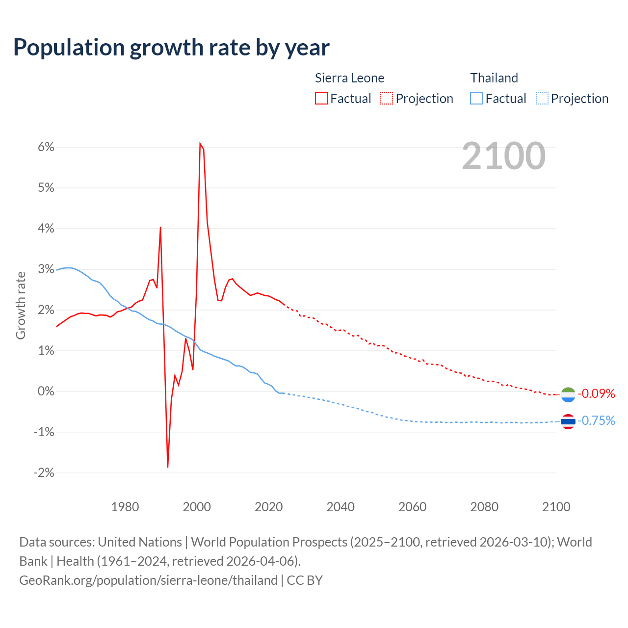 - For the last 10 years, Sierra Leone has had an average growth rate of +2.32% per year vs +0.23% in Thailand.