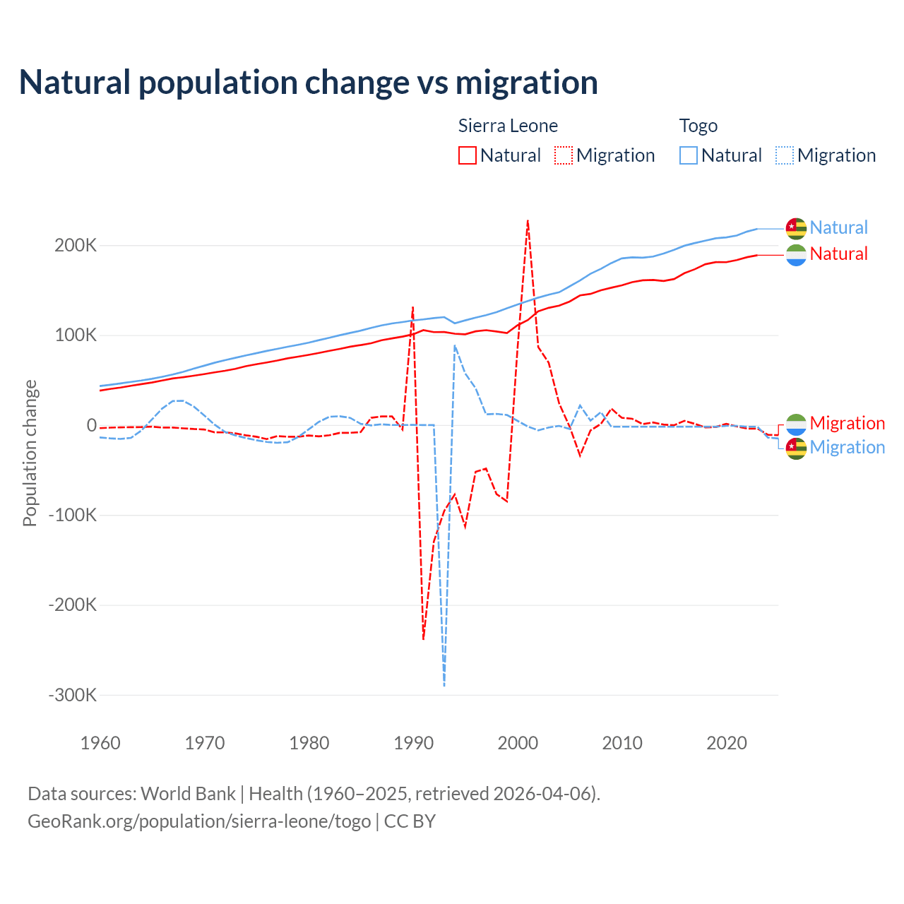 Over the last 10 years, 99.6% of the population change in Sierra Leone is from natural causes (a gain of 1,764,049 people) and 0.41% is from migration (a loss of 7,211 people). In Togo 99.1% is from natural causes (a gain of 2,052,115 people) and 0.86% is from migration (a loss of 17,852 people).