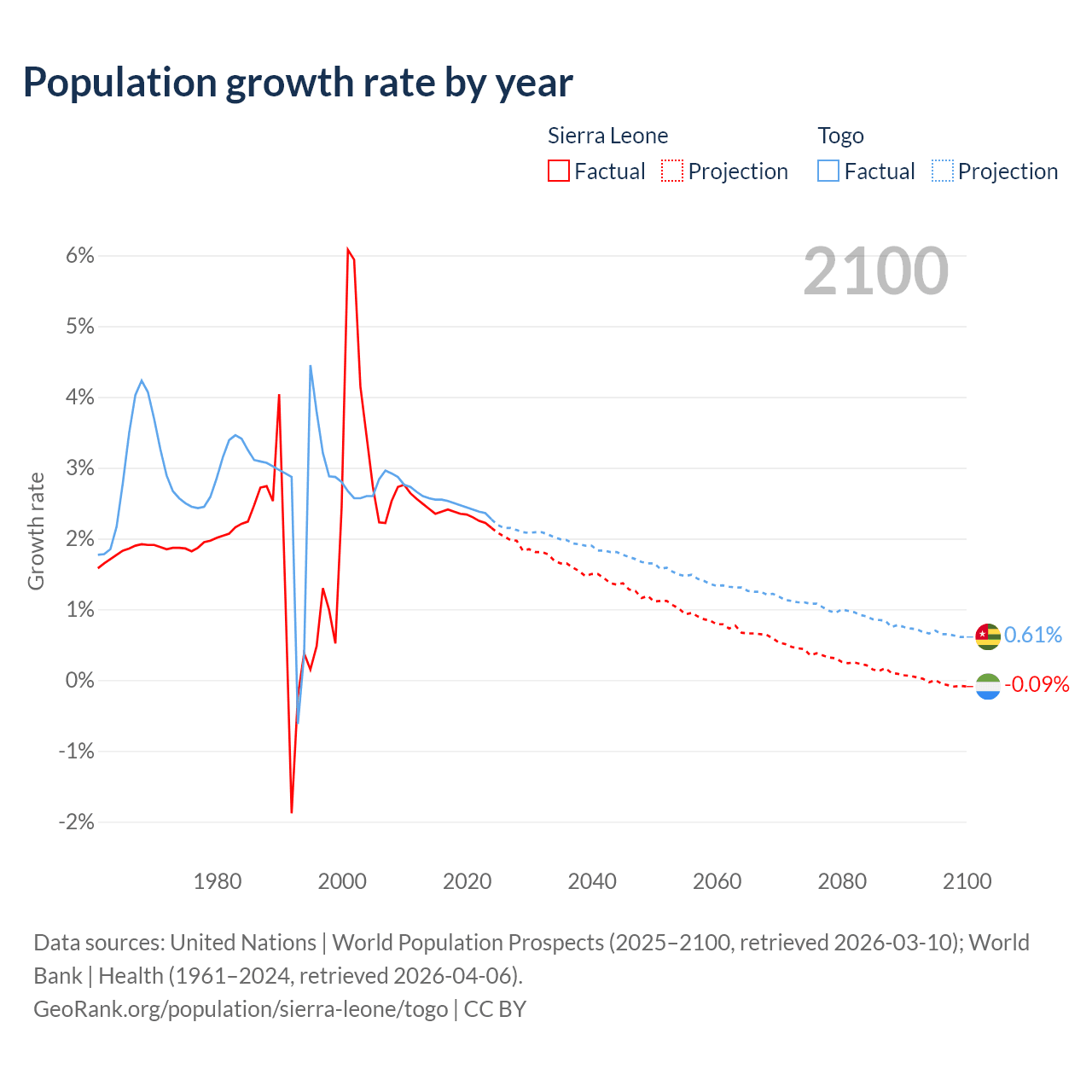 - For the last 10 years, Sierra Leone has had an average growth rate of +2.32% per year vs +2.46% in Togo.