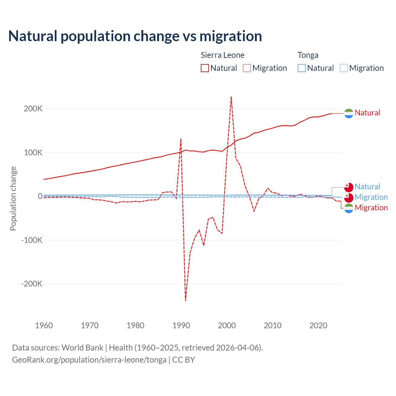 Over the last 10 years, 99.6% of the population change in Sierra Leone is from natural causes (a gain of 1,764,049 people) and 0.41% is from migration (a loss of 7,211 people). In Tonga 46.9% is from natural causes (a gain of 18,919 people) and 53.1% is from migration (a loss of 21,384 people).