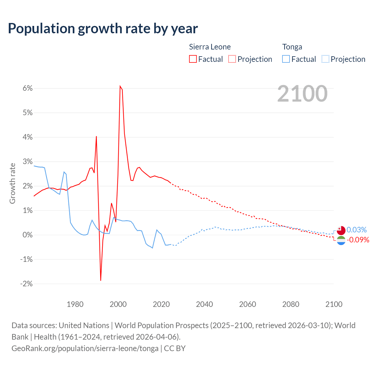 - For the last 10 years, Sierra Leone has had an average growth rate of +2.32% per year vs -0.25% in Tonga.