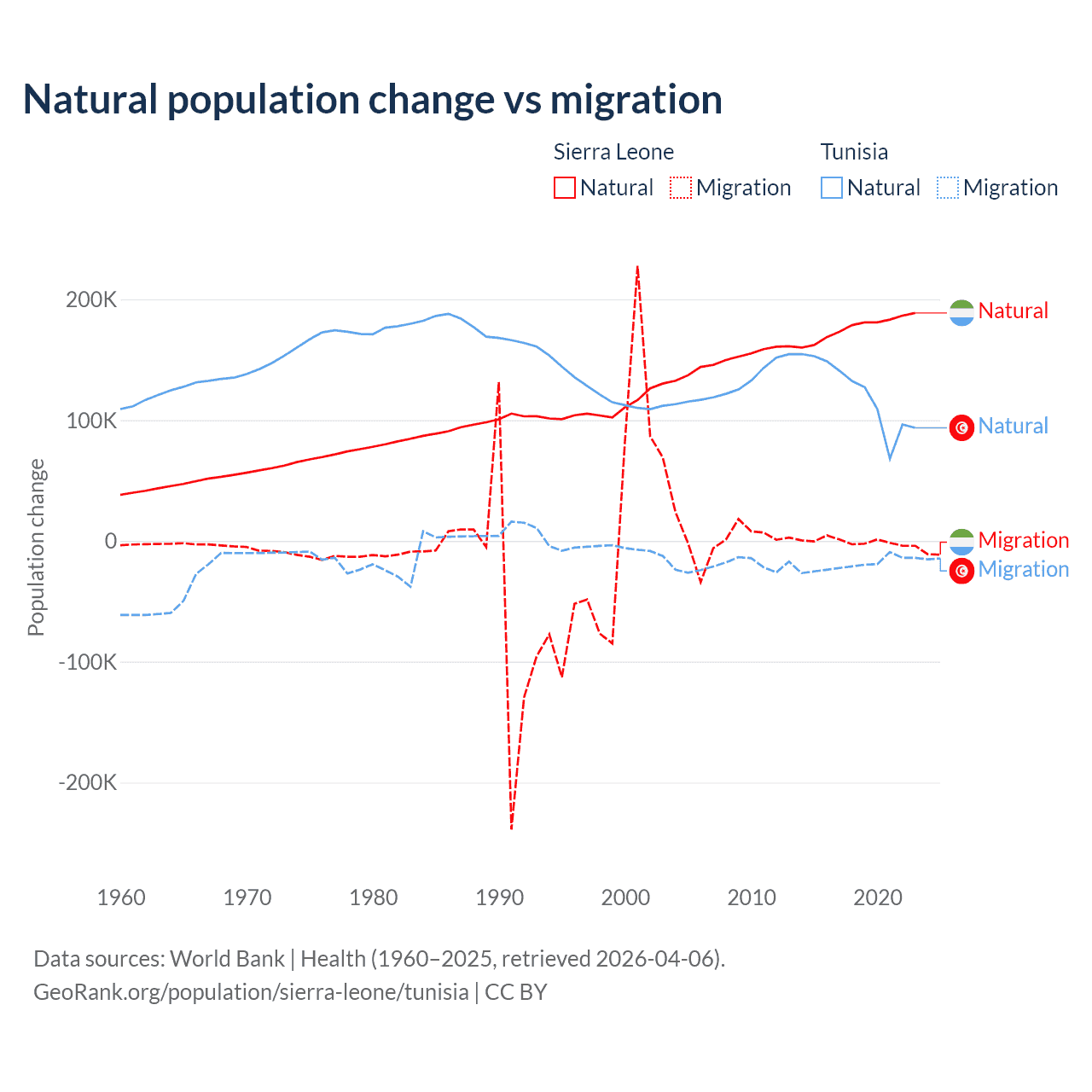 Over the last 10 years, 99.6% of the population change in Sierra Leone is from natural causes (a gain of 1,764,049 people) and 0.41% is from migration (a loss of 7,211 people). In Tunisia 86.3% is from natural causes (a gain of 1,225,079 people) and 13.7% is from migration (a loss of 195,011 people).