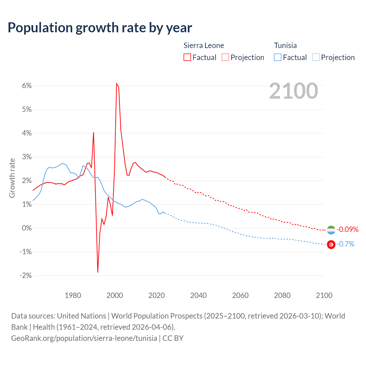 - For the last 10 years, Sierra Leone has had an average growth rate of +2.32% per year vs +0.89% in Tunisia.