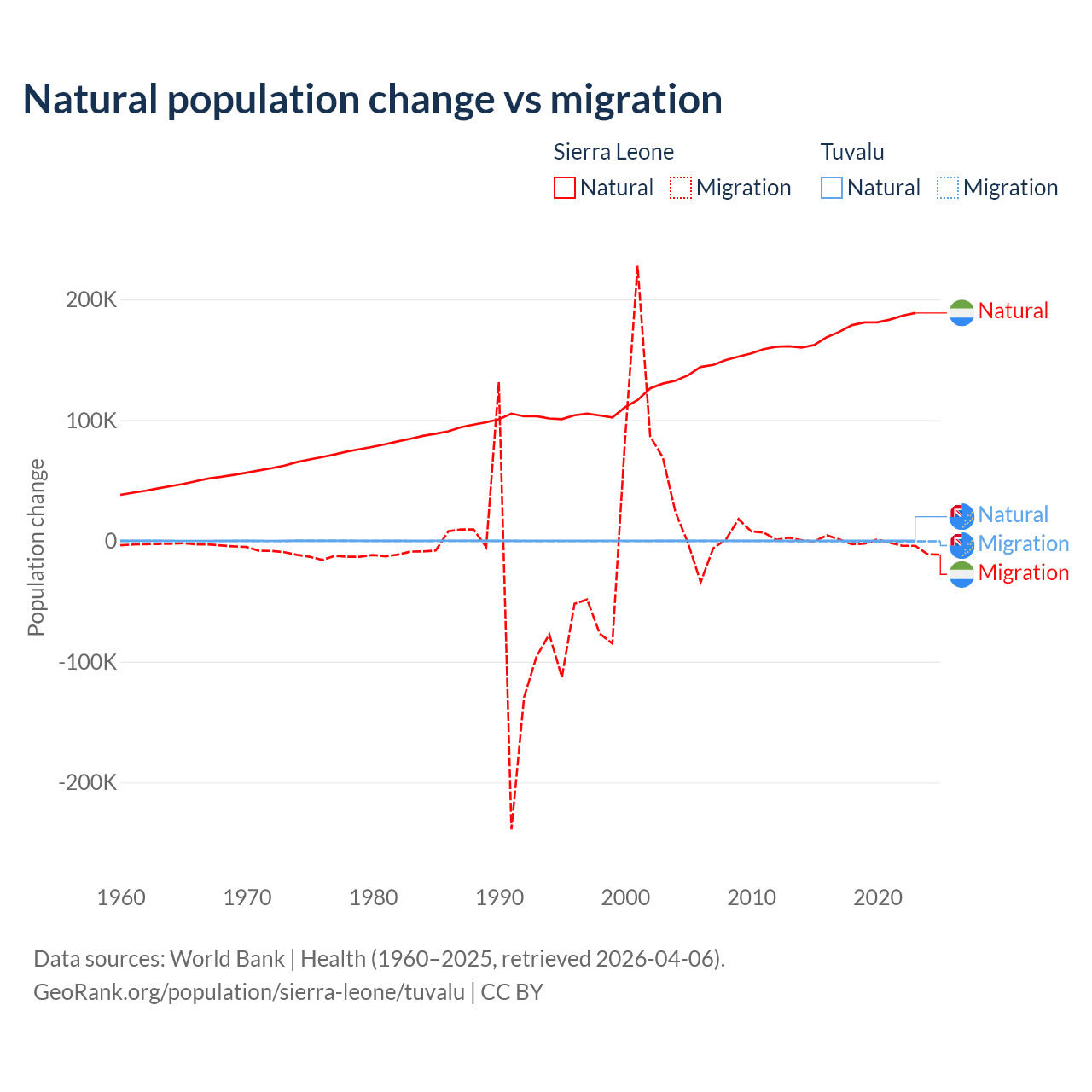 Over the last 10 years, 99.6% of the population change in Sierra Leone is from natural causes (a gain of 1,764,049 people) and 0.41% is from migration (a loss of 7,211 people). In Tuvalu 35.5% is from natural causes (a gain of 1,556 people) and 64.5% is from migration (a loss of 2,827 people).