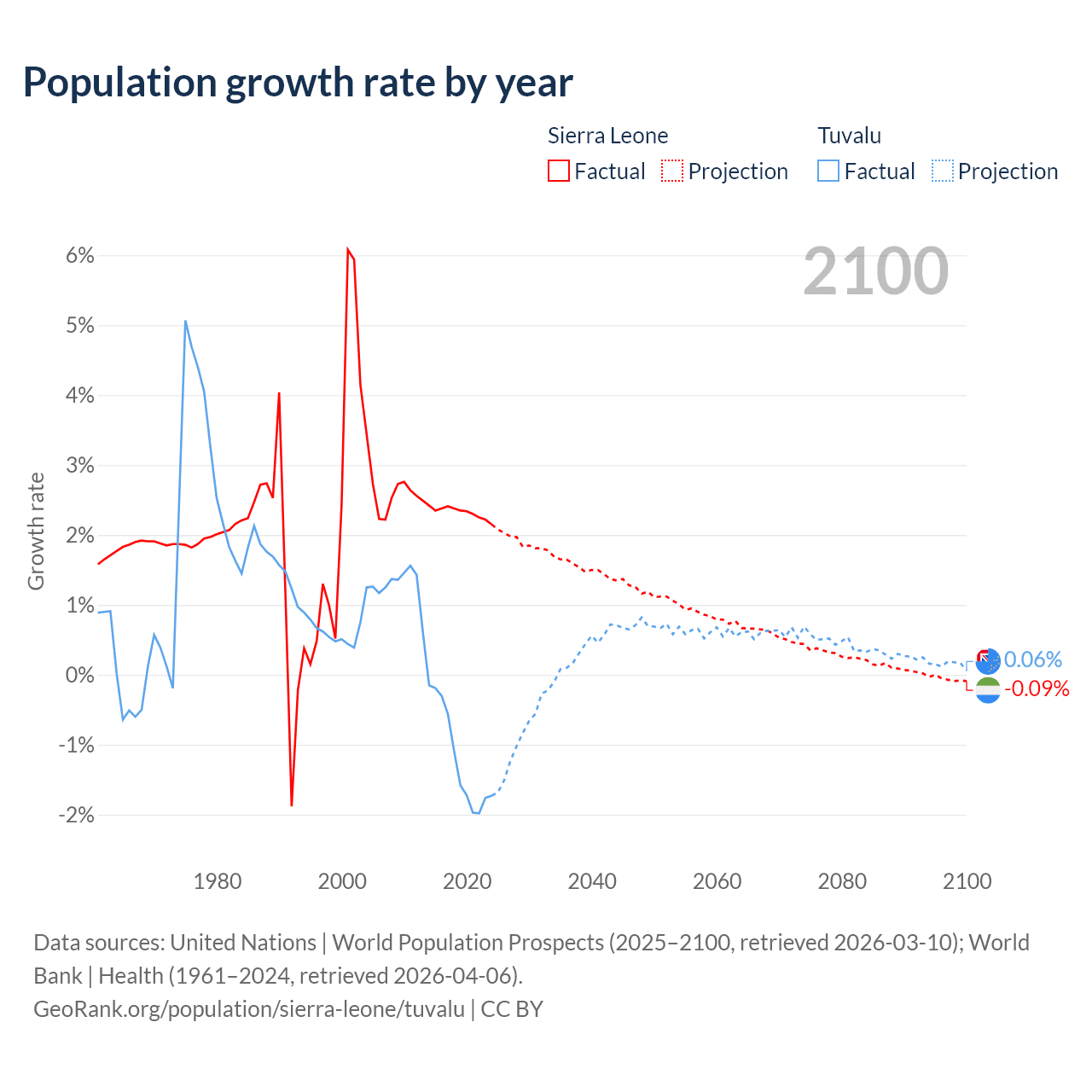 - For the last 10 years, Sierra Leone has had an average growth rate of +2.32% per year vs -1.19% in Tuvalu.