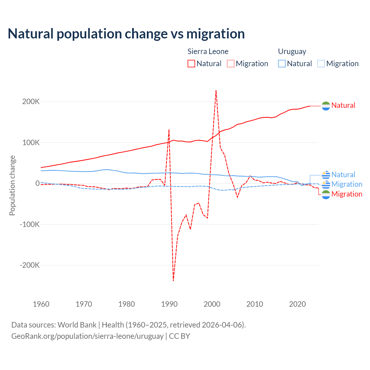 Over the last 10 years, 99.6% of the population change in Sierra Leone is from natural causes (a gain of 1,764,049 people) and 0.41% is from migration (a loss of 7,211 people). In Uruguay 70% is from natural causes (a gain of 64,303 people) and 30% is from migration (a loss of 27,501 people).