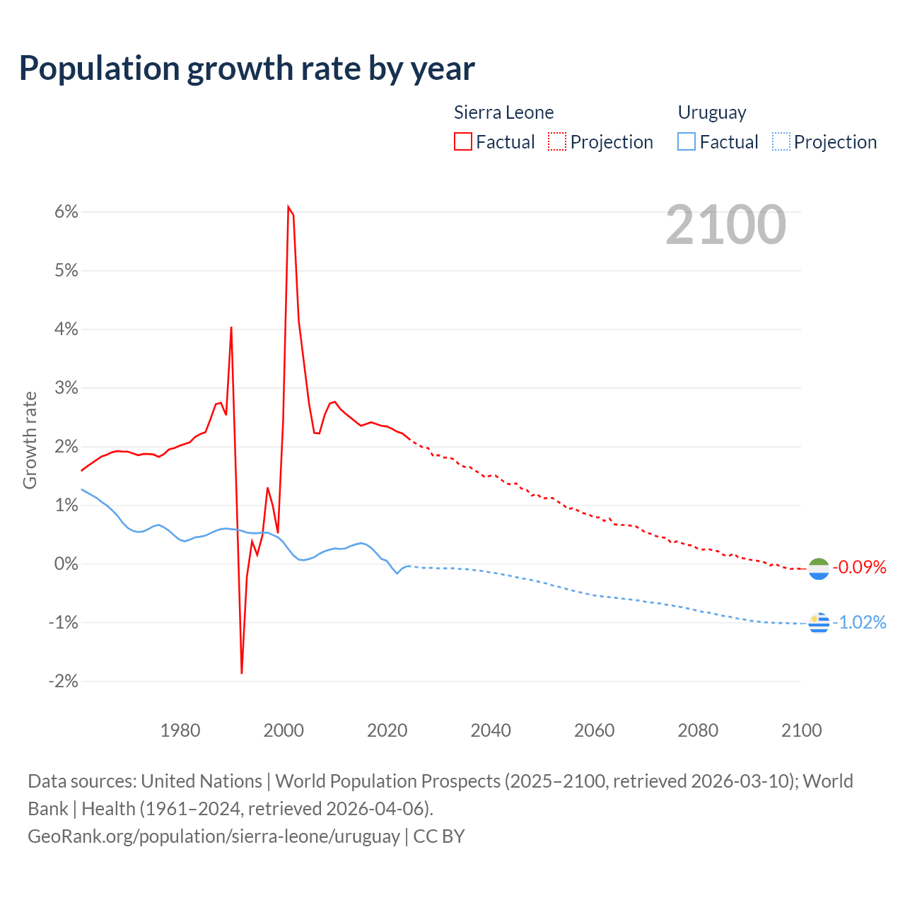 - For the last 10 years, Sierra Leone has had an average growth rate of +2.32% per year vs +0.11% in Uruguay.