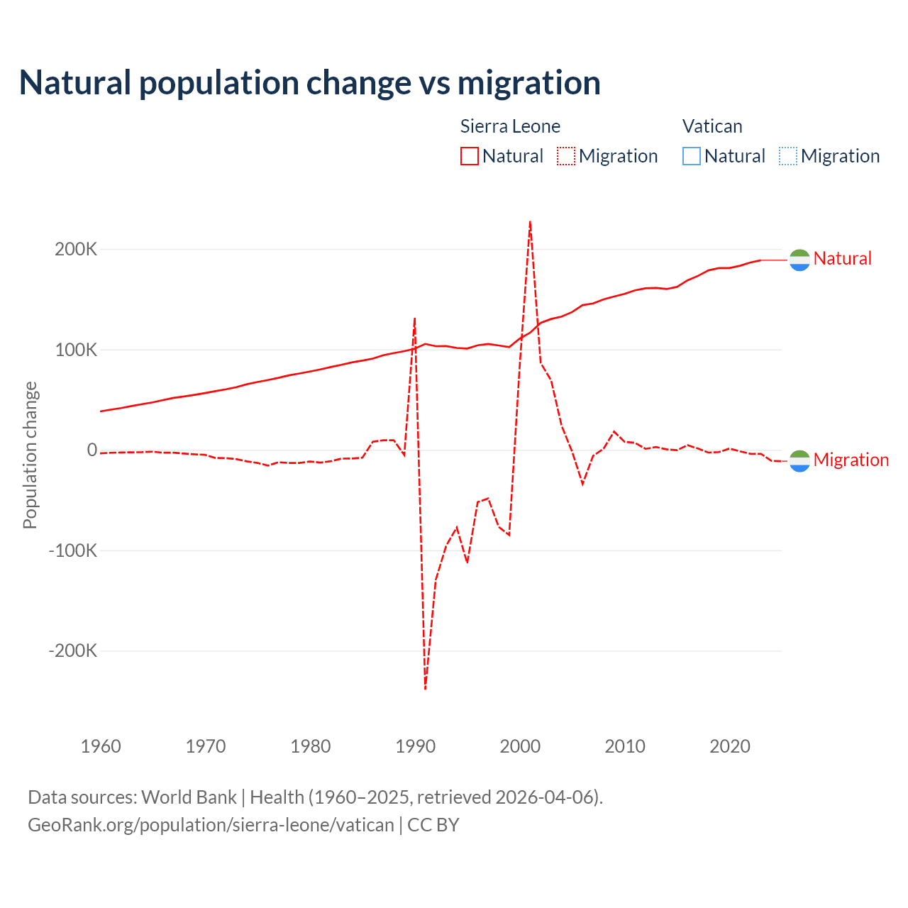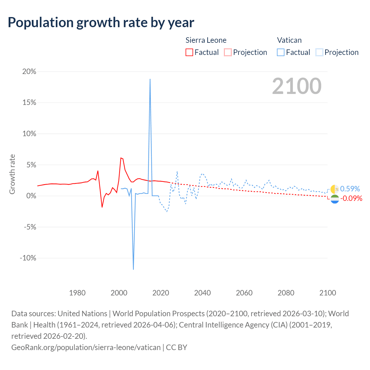 - For the last 10 years, Sierra Leone has had an average growth rate of +2.32% per year vs +1.9% in the Vatican.