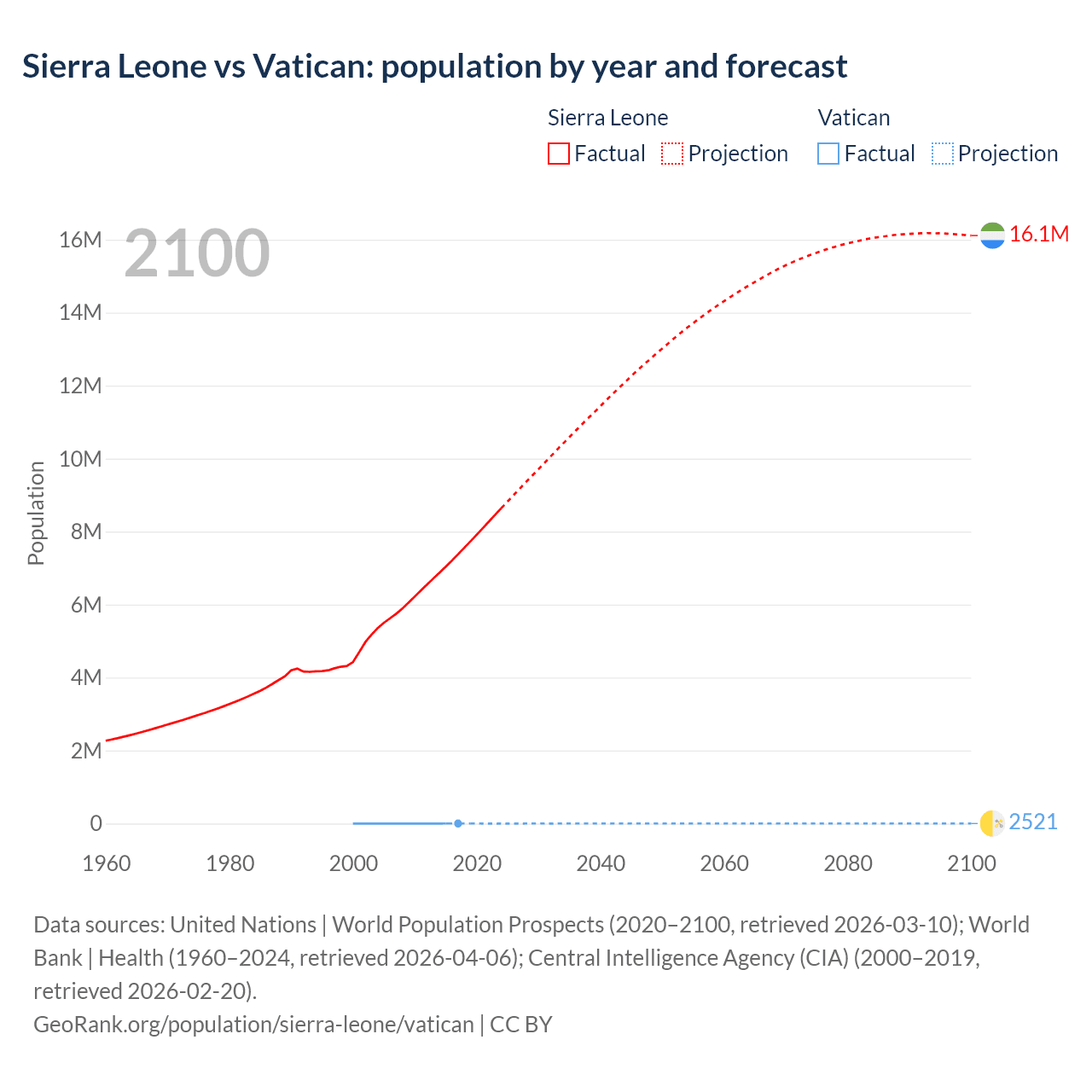 The latest officially reported population of Sierra Leone was 8,642,022 in 2024 vs 1,000 people in the Vatican in 2019. In 2026, based on the adjusted UN estimation, the current Sierra Leone's population is 9,049,533 people compared to 936 in the Vatican.