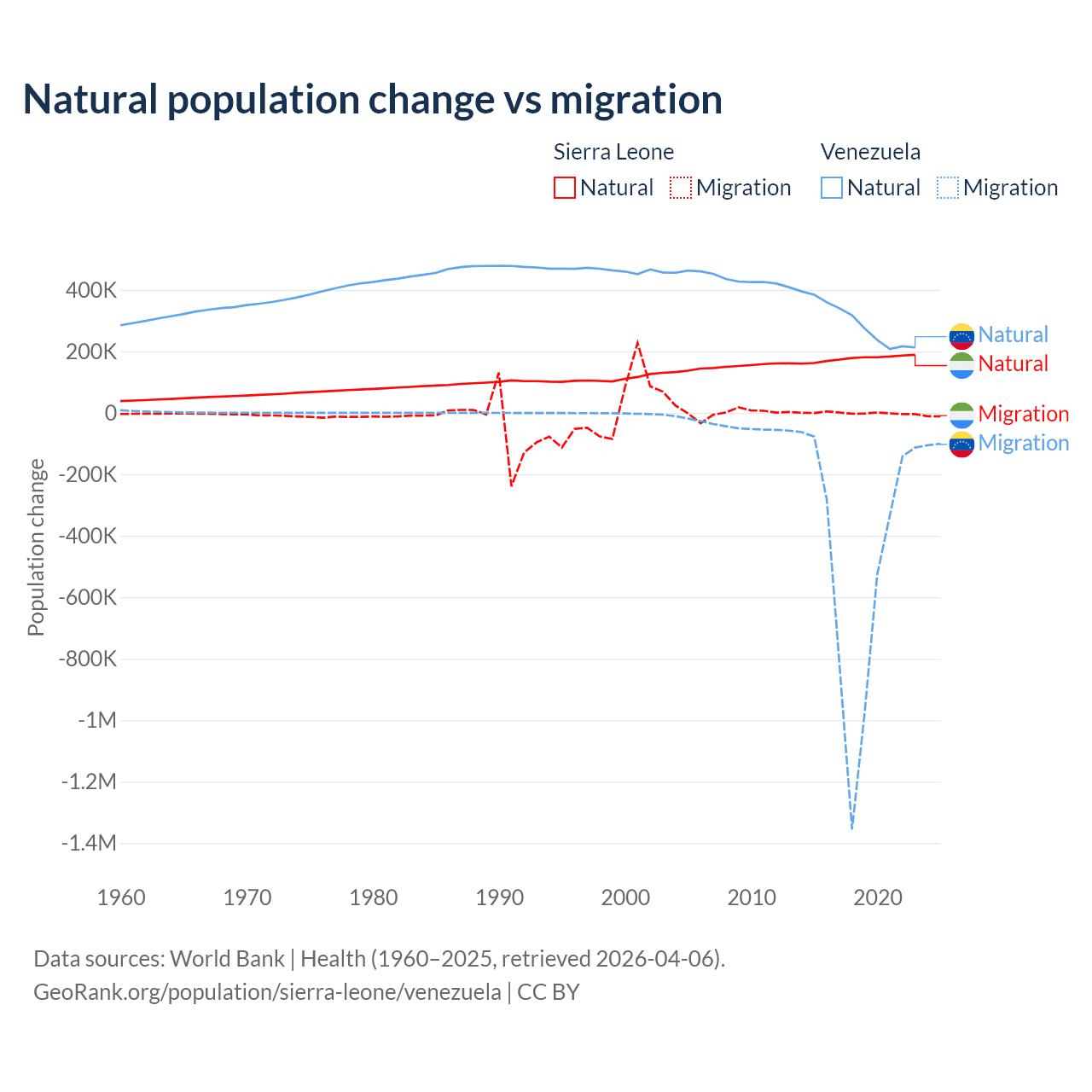 Over the last 10 years, 99.6% of the population change in Sierra Leone is from natural causes (a gain of 1,764,049 people) and 0.41% is from migration (a loss of 7,211 people). In Venezuela 38.6% is from natural causes (a gain of 2,946,257 people) and 61.4% is from migration (a loss of 4,683,227 people).
