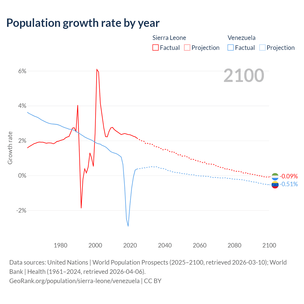 - For the last 10 years, Sierra Leone has had an average growth rate of +2.32% per year vs -0.46% in Venezuela.