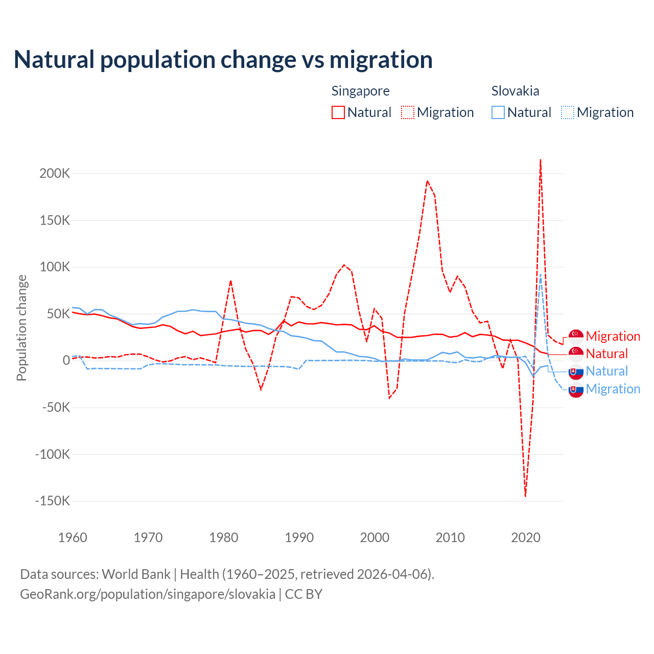 Over the last 10 years, 54.8% of the population change in Singapore is from natural causes (a gain of 195,953 people) and 45.2% is from migration (a gain of 161,805 people). In Slovakia 7.47% is from natural causes (a loss of 8,728 people) and 92.5% is from migration (a gain of 108,156 people).