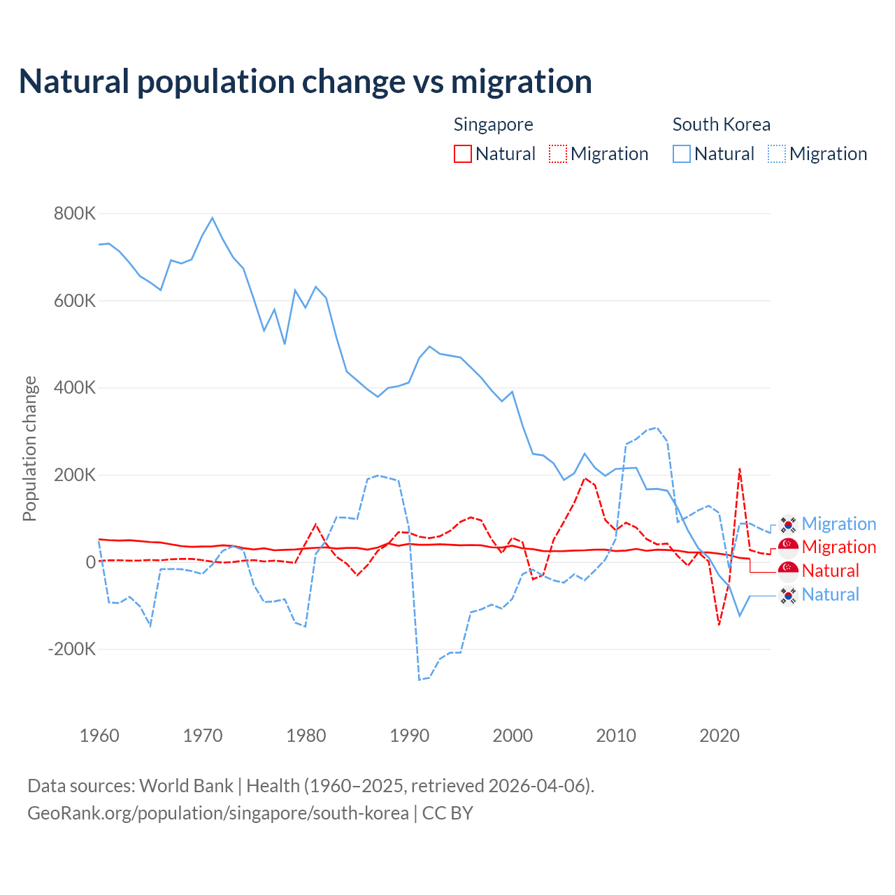 Over the last 10 years, 54.8% of the population change in Singapore is from natural causes (a gain of 195,953 people) and 45.2% is from migration (a gain of 161,805 people). In South Korea 17.6% is from natural causes (a gain of 277,215 people) and 82.4% is from migration (a gain of 1,298,356 people).