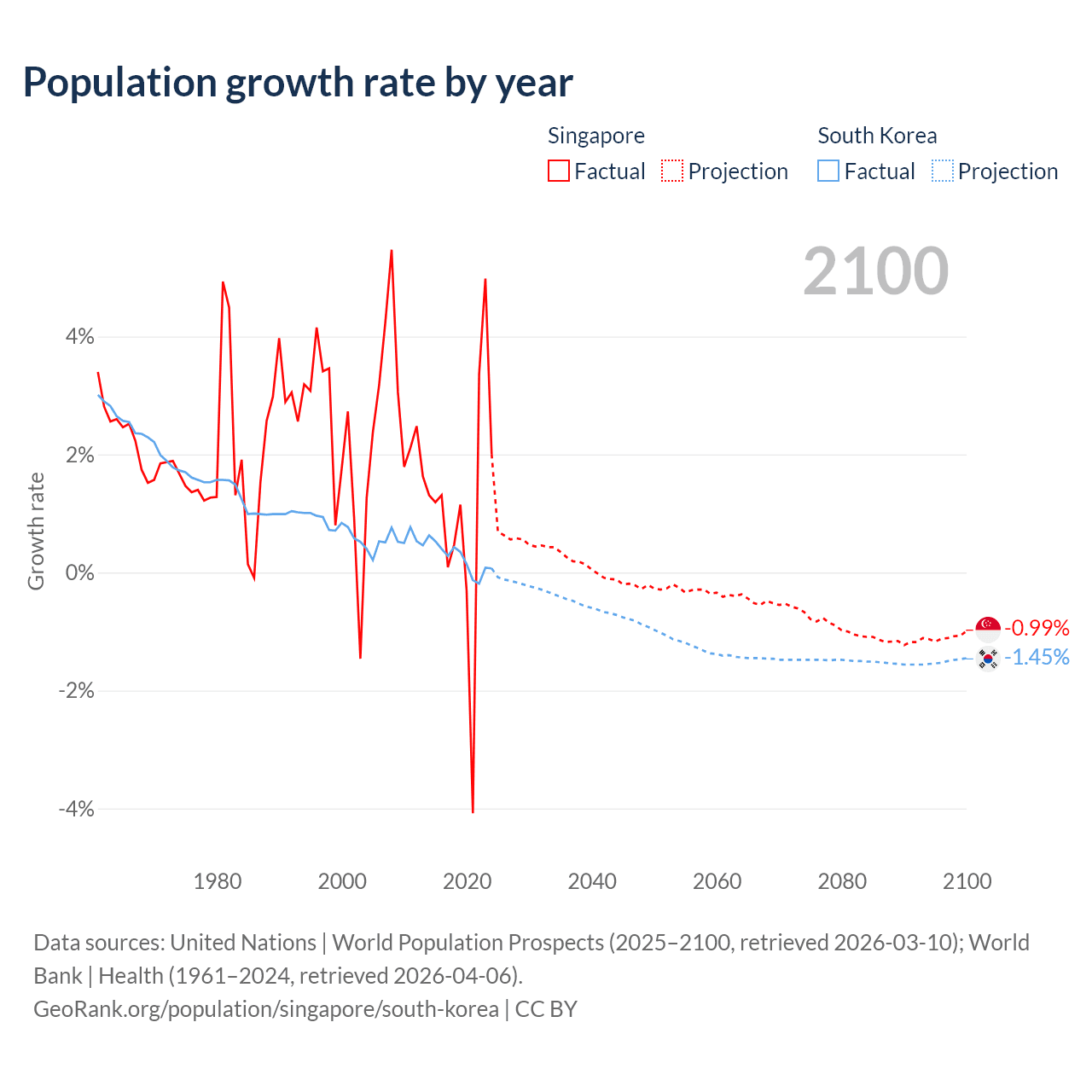 - For the last 10 years, Singapore has had an average growth rate of +1.04% per year vs +0.24% in South Korea.