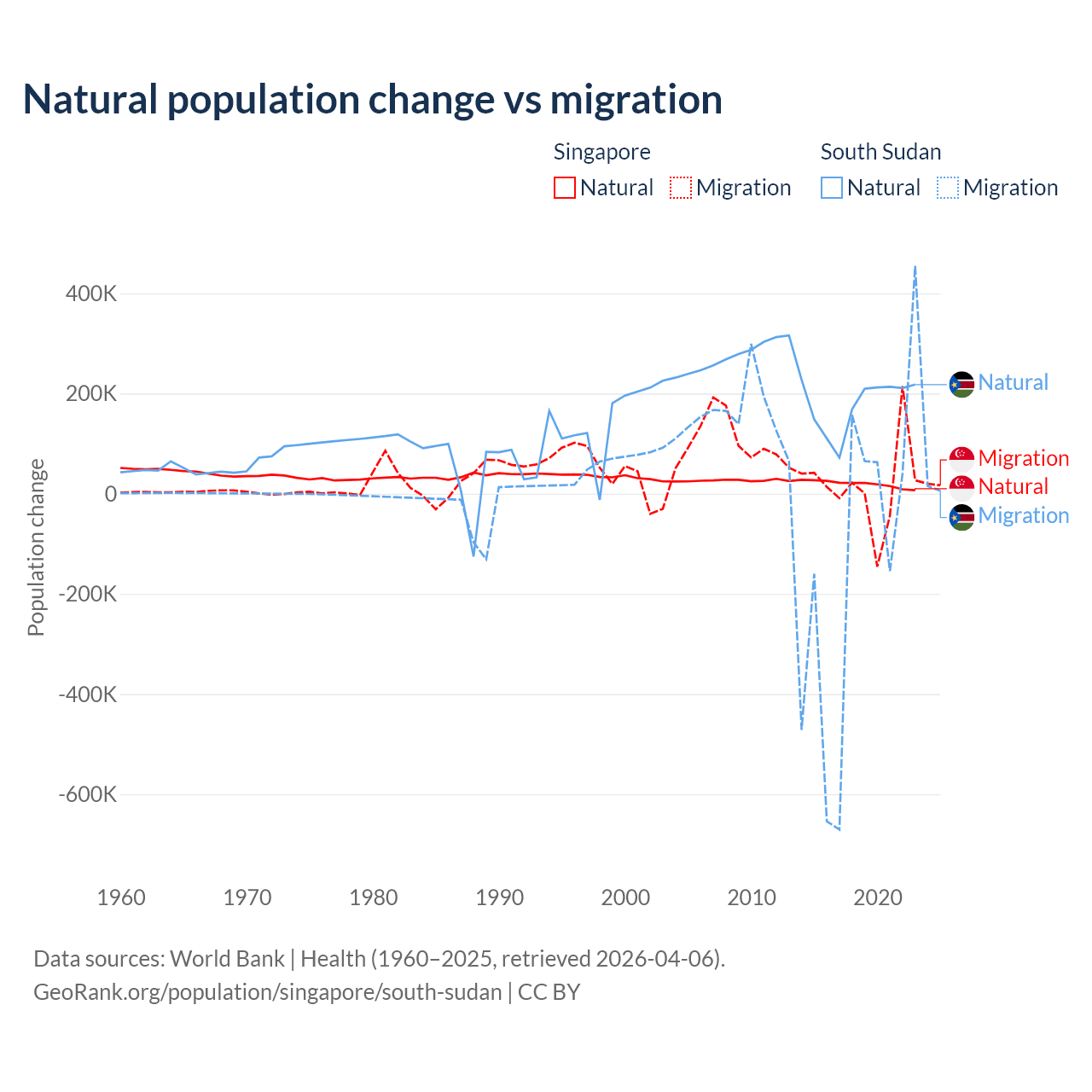 Over the last 10 years, 54.8% of the population change in Singapore is from natural causes (a gain of 195,953 people) and 45.2% is from migration (a gain of 161,805 people). In South Sudan 57.4% is from natural causes (a gain of 1,792,135 people) and 42.6% is from migration (a loss of 1,329,606 people).