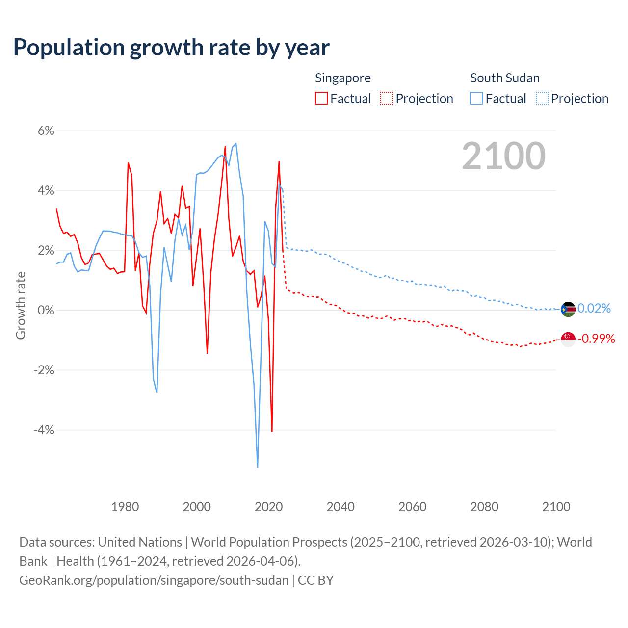 - For the last 10 years, Singapore has had an average growth rate of +1.04% per year vs +0.65% in South Sudan.