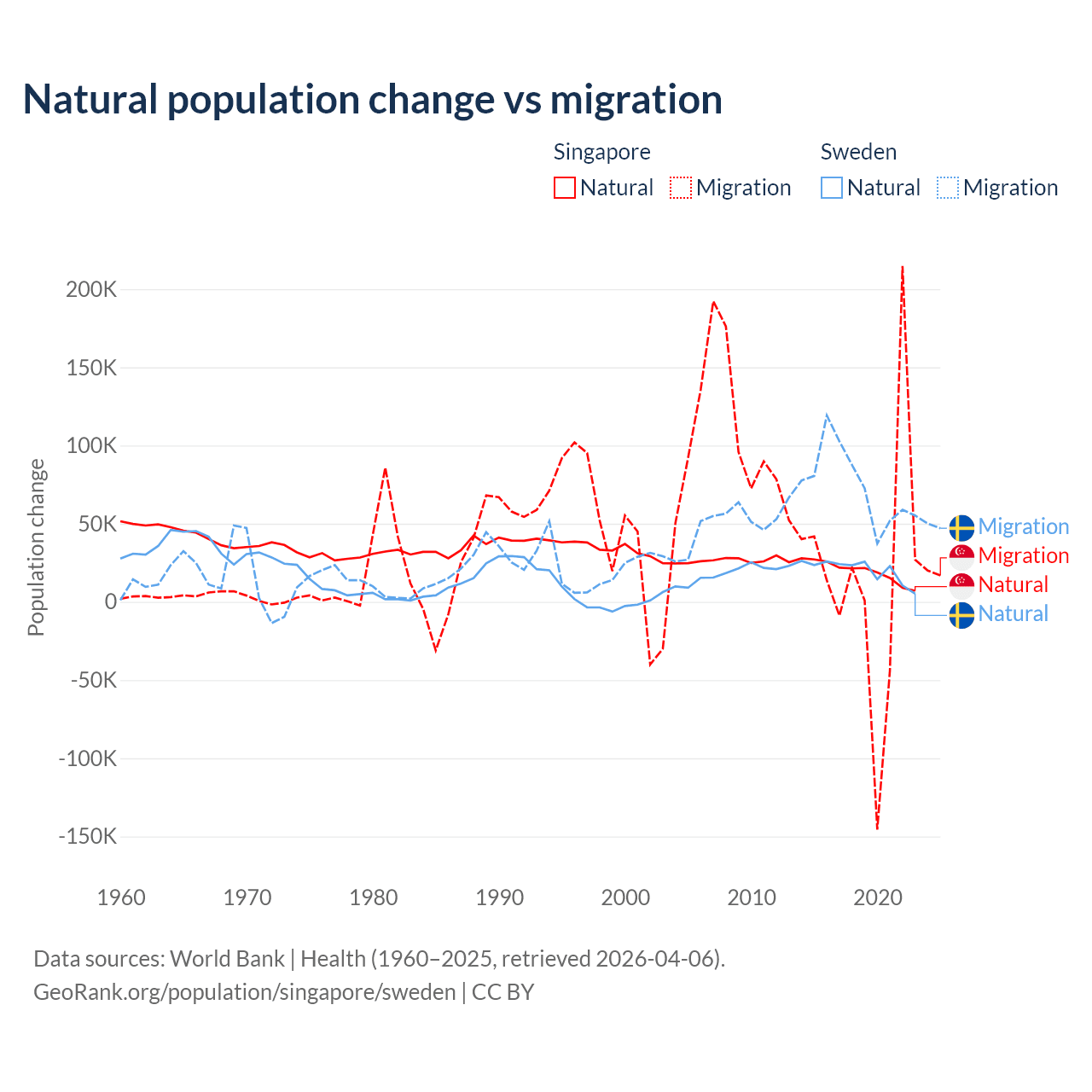 Over the last 10 years, 54.8% of the population change in Singapore is from natural causes (a gain of 195,953 people) and 45.2% is from migration (a gain of 161,805 people). In Sweden 21.4% is from natural causes (a gain of 201,900 people) and 78.6% is from migration (a gain of 743,642 people).