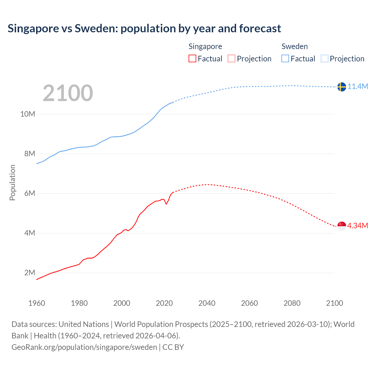 Singapore vs Sweden: population by year and forecast