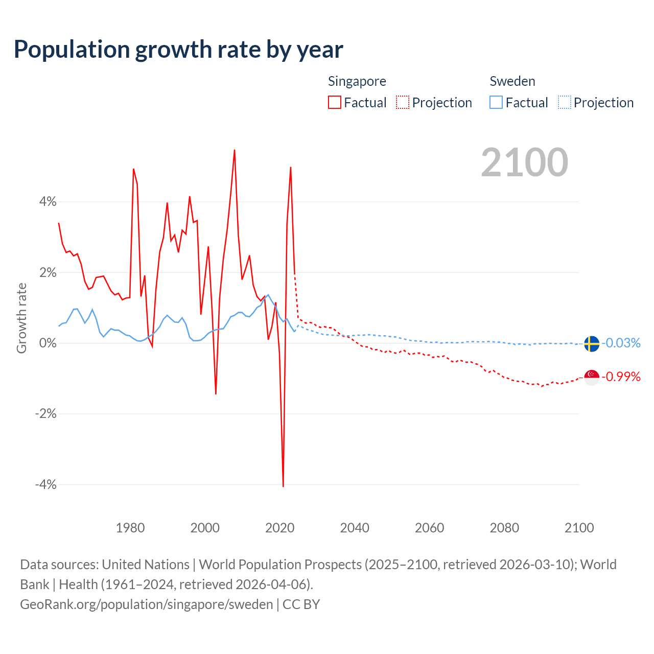 - For the last 10 years, Singapore has had an average growth rate of +1.04% per year vs +0.88% in Sweden.