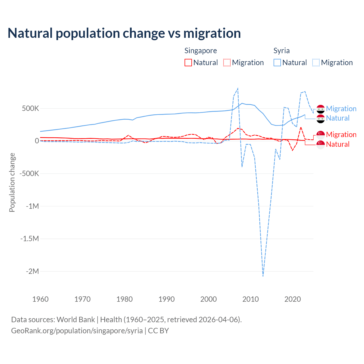 Over the last 10 years, 54.8% of the population change in Singapore is from natural causes (a gain of 195,953 people) and 45.2% is from migration (a gain of 161,805 people). In Syria 91.3% is from natural causes (a gain of 3,047,621 people) and 8.72% is from migration (a gain of 291,069 people).