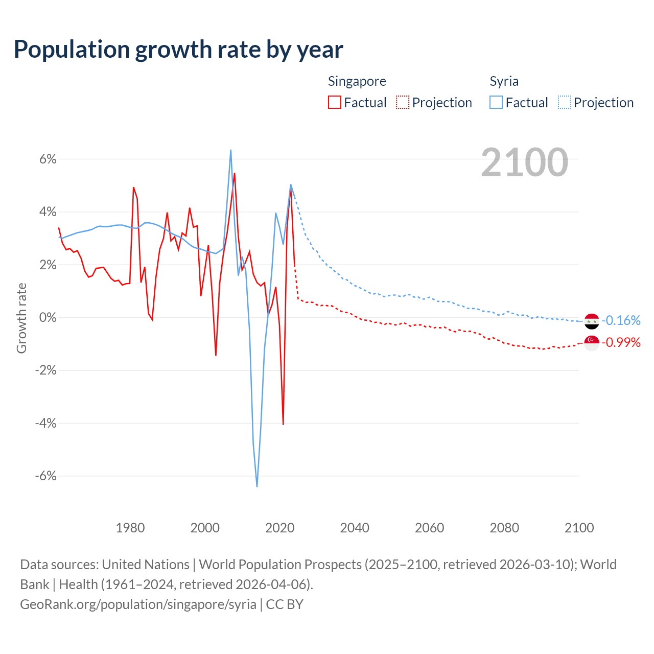 - For the last 10 years, Singapore has had an average growth rate of +1.04% per year vs +1.25% in Syria.