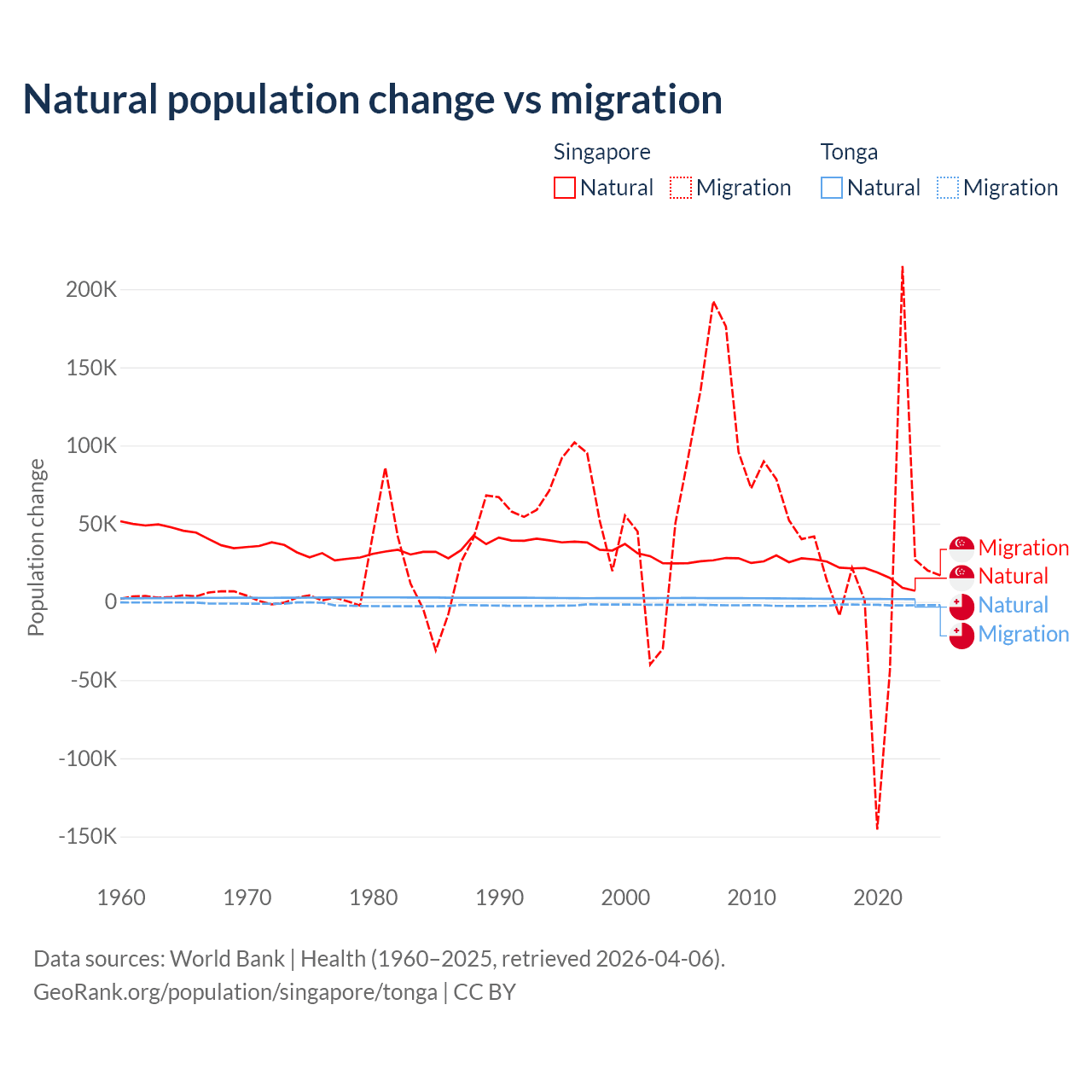 Over the last 10 years, 54.8% of the population change in Singapore is from natural causes (a gain of 195,953 people) and 45.2% is from migration (a gain of 161,805 people). In Tonga 46.9% is from natural causes (a gain of 18,919 people) and 53.1% is from migration (a loss of 21,384 people).