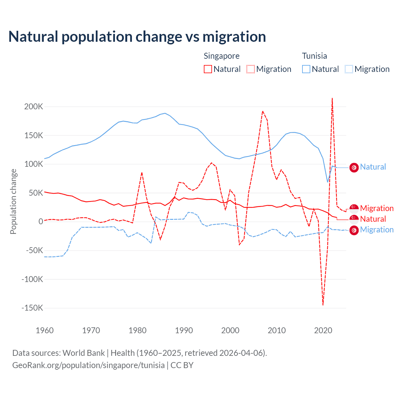 Over the last 10 years, 54.8% of the population change in Singapore is from natural causes (a gain of 195,953 people) and 45.2% is from migration (a gain of 161,805 people). In Tunisia 86.3% is from natural causes (a gain of 1,225,079 people) and 13.7% is from migration (a loss of 195,011 people).