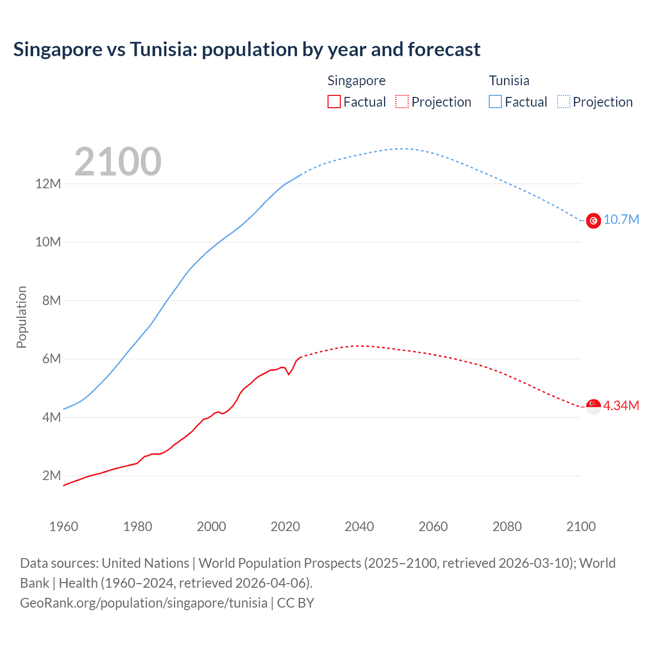 Singapore vs Tunisia: population by year and forecast