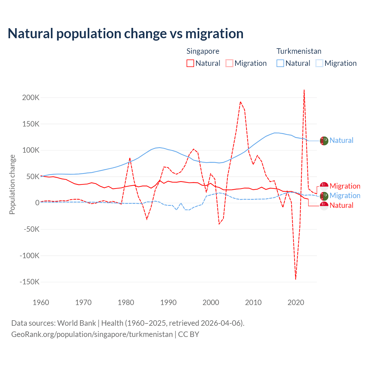 Over the last 10 years, 54.8% of the population change in Singapore is from natural causes (a gain of 195,953 people) and 45.2% is from migration (a gain of 161,805 people). In Turkmenistan 89.2% is from natural causes (a gain of 1,270,228 people) and 10.8% is from migration (a gain of 154,379 people).