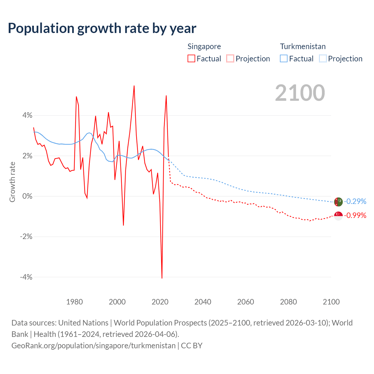- For the last 10 years, Singapore has had an average growth rate of +1.04% per year vs +2.14% in Turkmenistan.