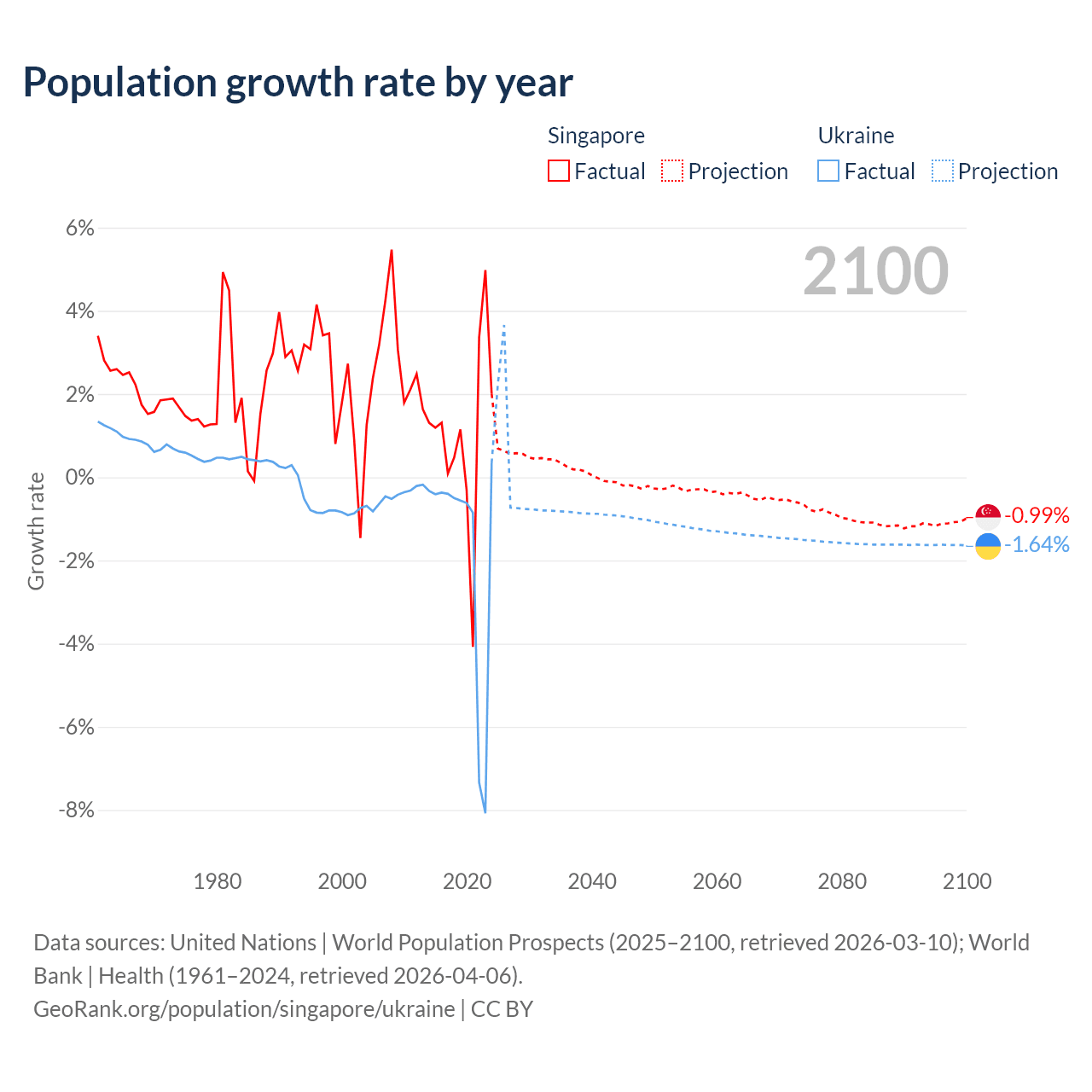 - For the last 10 years, Singapore has had an average growth rate of +1.04% per year vs -1.74% in Ukraine.