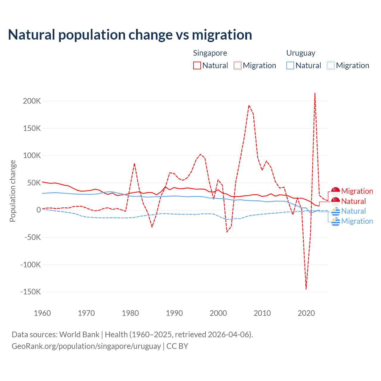 Over the last 10 years, 54.8% of the population change in Singapore is from natural causes (a gain of 195,953 people) and 45.2% is from migration (a gain of 161,805 people). In Uruguay 70% is from natural causes (a gain of 64,303 people) and 30% is from migration (a loss of 27,501 people).
