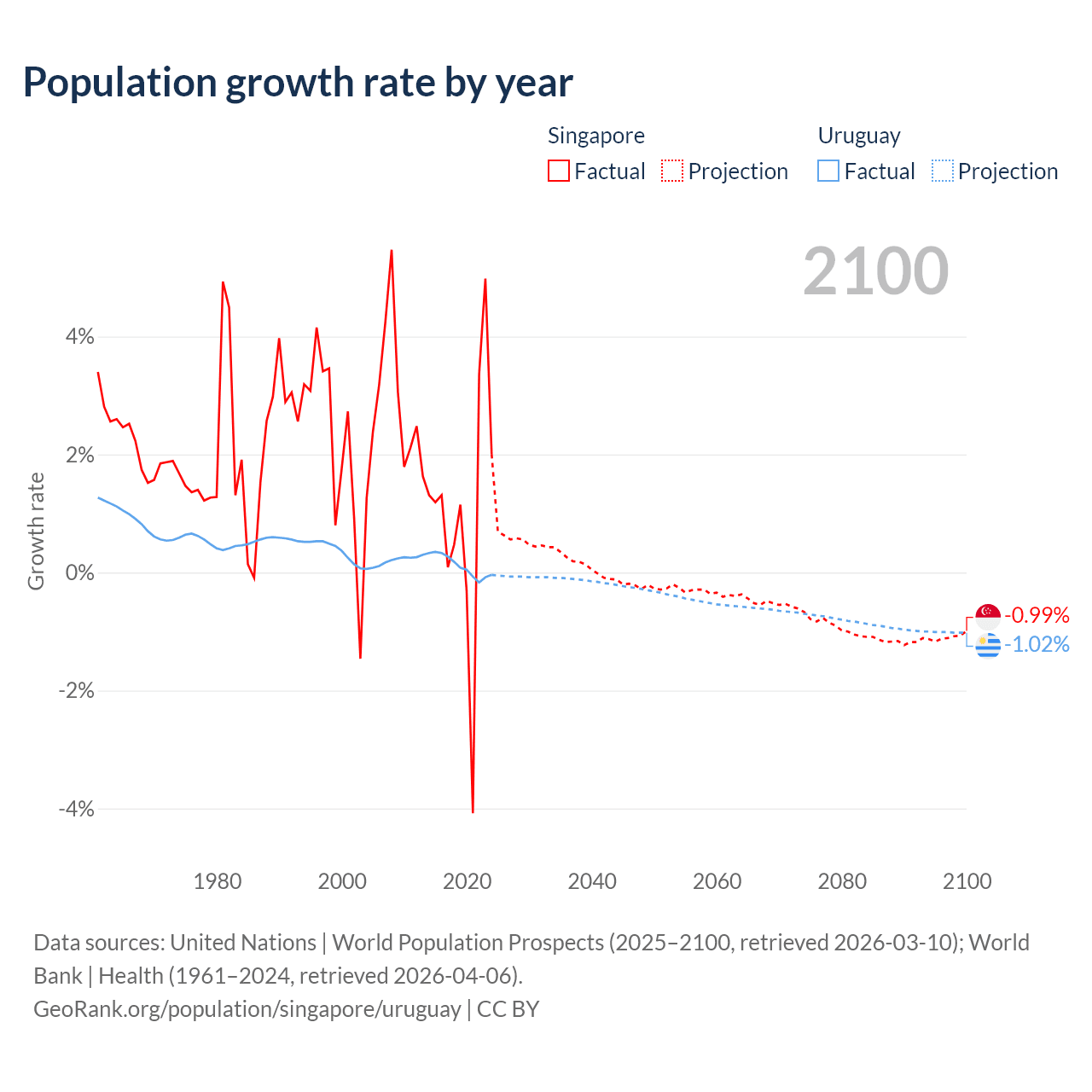 - For the last 10 years, Singapore has had an average growth rate of +1.04% per year vs +0.11% in Uruguay.