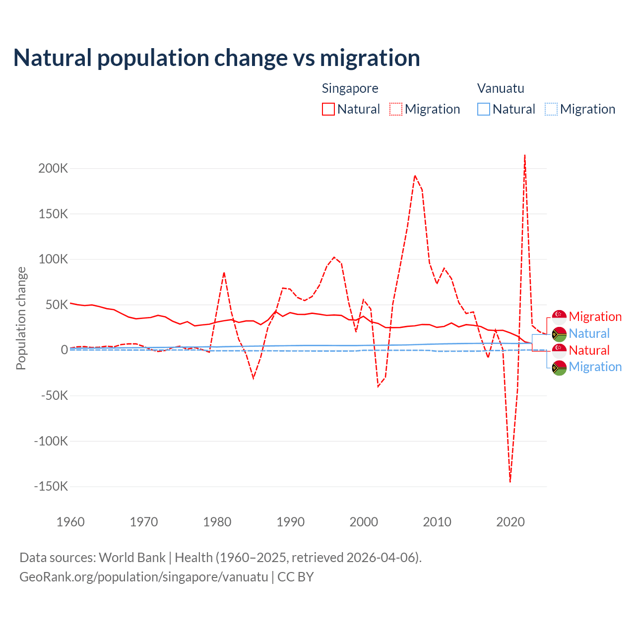 Over the last 10 years, 54.8% of the population change in Singapore is from natural causes (a gain of 195,953 people) and 45.2% is from migration (a gain of 161,805 people). In Vanuatu 92.2% is from natural causes (a gain of 72,941 people) and 7.81% is from migration (a loss of 6,181 people).