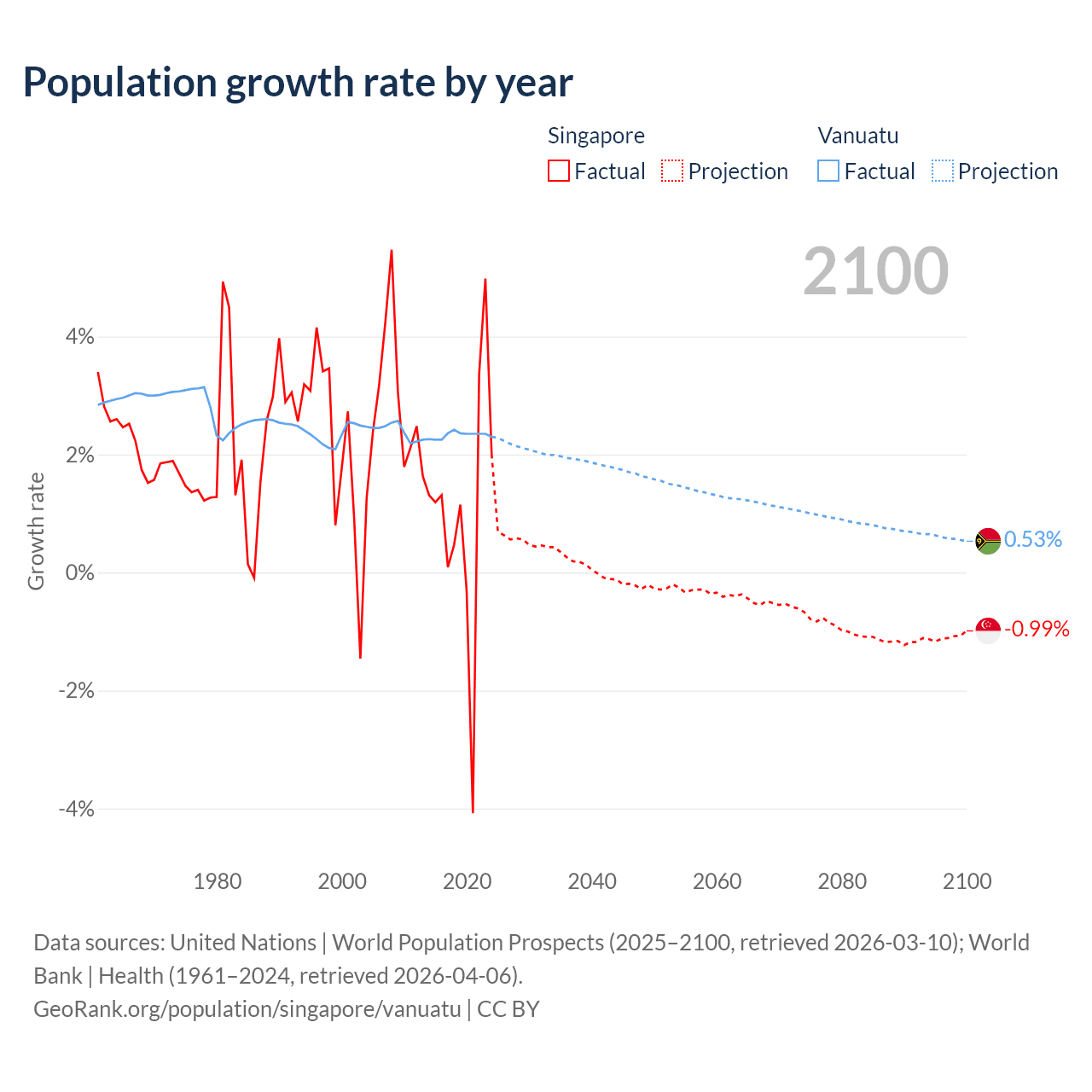 - For the last 10 years, Singapore has had an average growth rate of +1.04% per year vs +2.33% in Vanuatu.