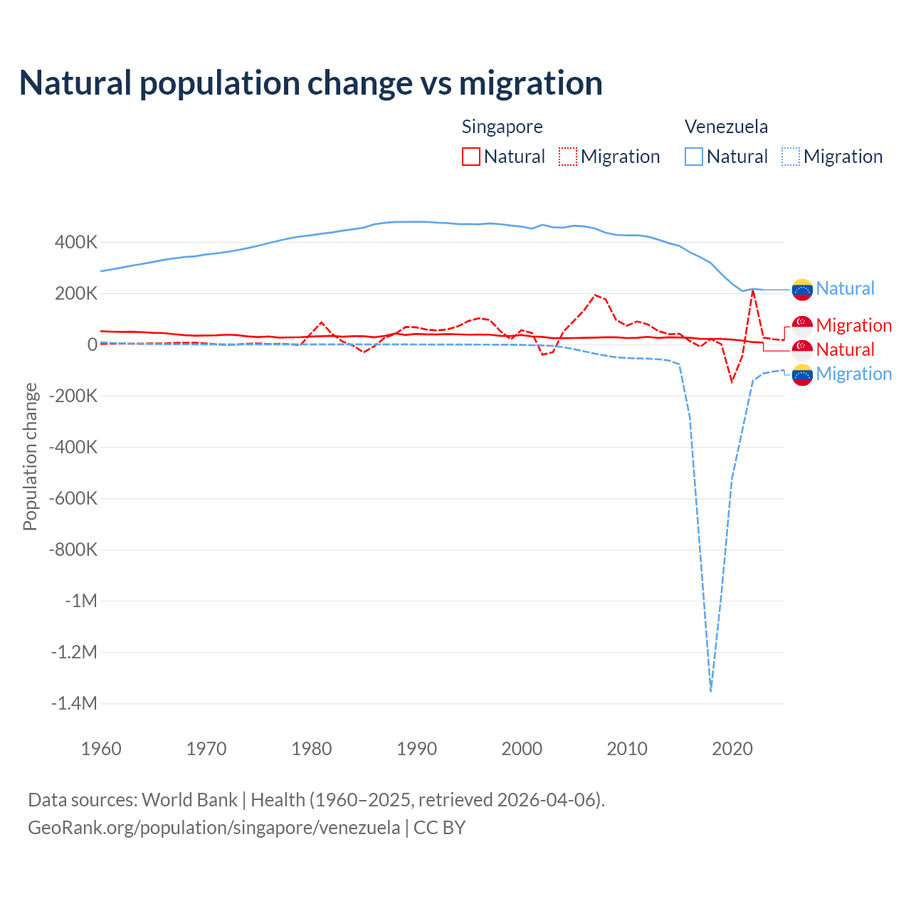 Over the last 10 years, 54.8% of the population change in Singapore is from natural causes (a gain of 195,953 people) and 45.2% is from migration (a gain of 161,805 people). In Venezuela 38.6% is from natural causes (a gain of 2,946,257 people) and 61.4% is from migration (a loss of 4,683,227 people).