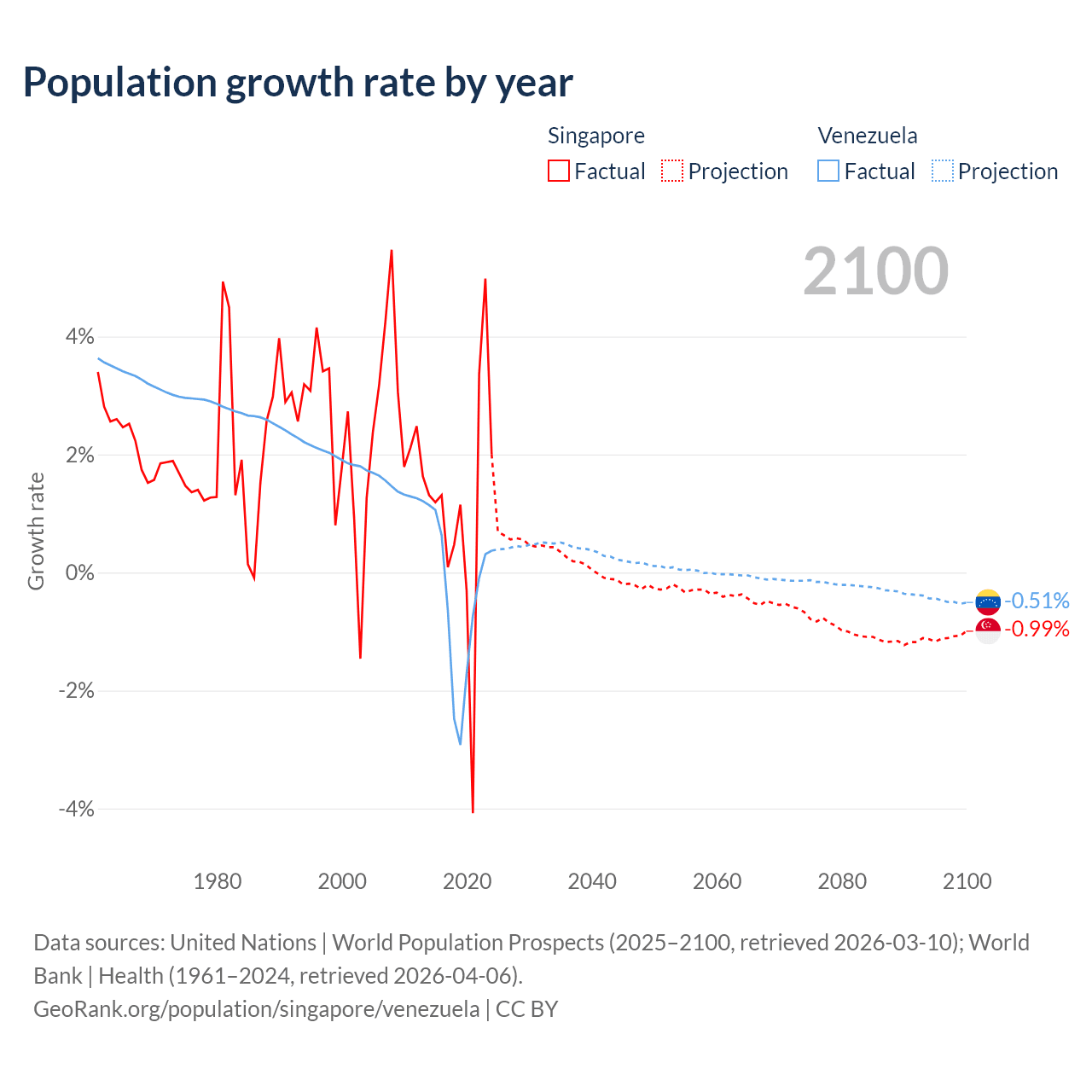 - For the last 10 years, Singapore has had an average growth rate of +1.04% per year vs -0.46% in Venezuela.