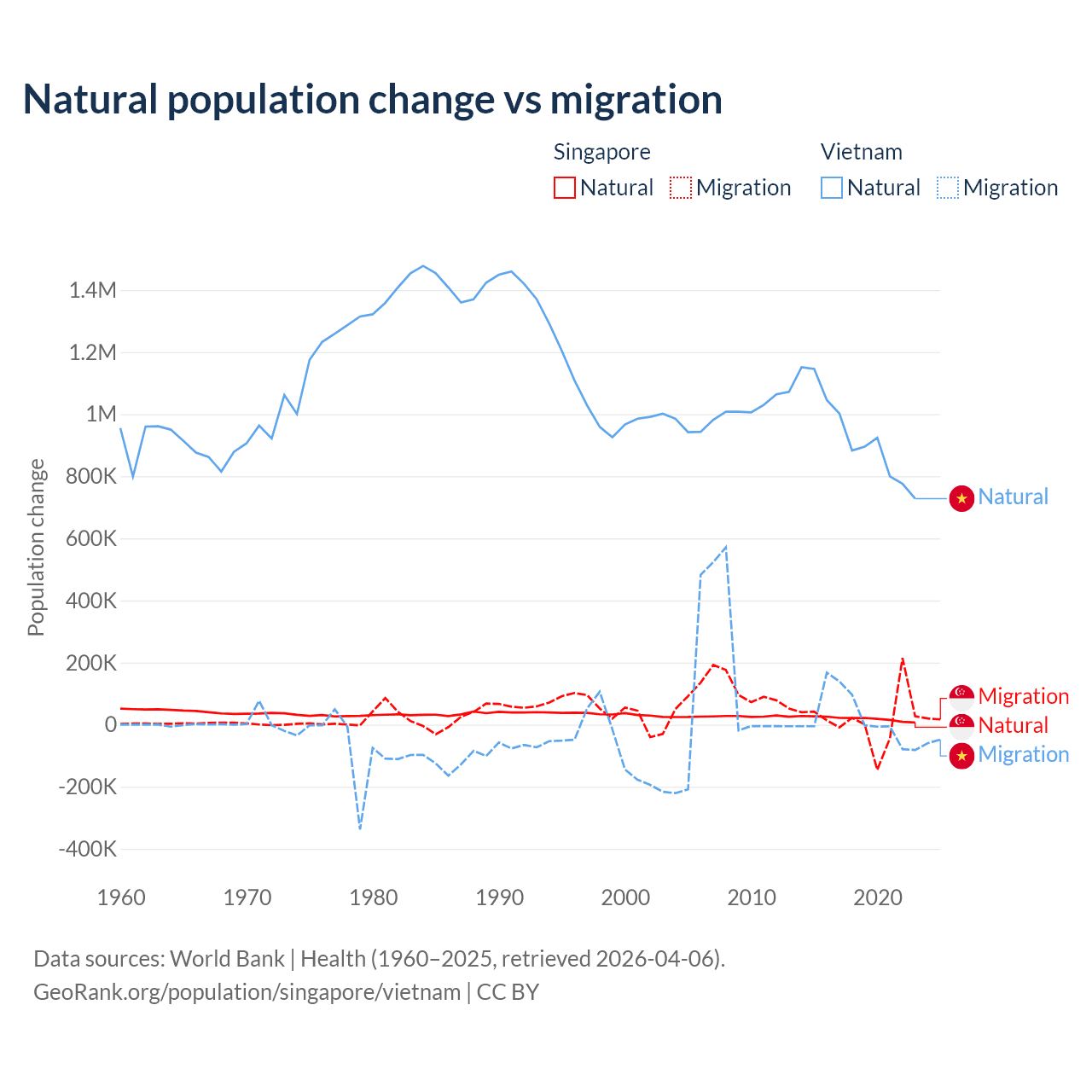 Over the last 10 years, 54.8% of the population change in Singapore is from natural causes (a gain of 195,953 people) and 45.2% is from migration (a gain of 161,805 people). In Vietnam 97.7% is from natural causes (a gain of 9,349,756 people) and 2.29% is from migration (a gain of 219,073 people).