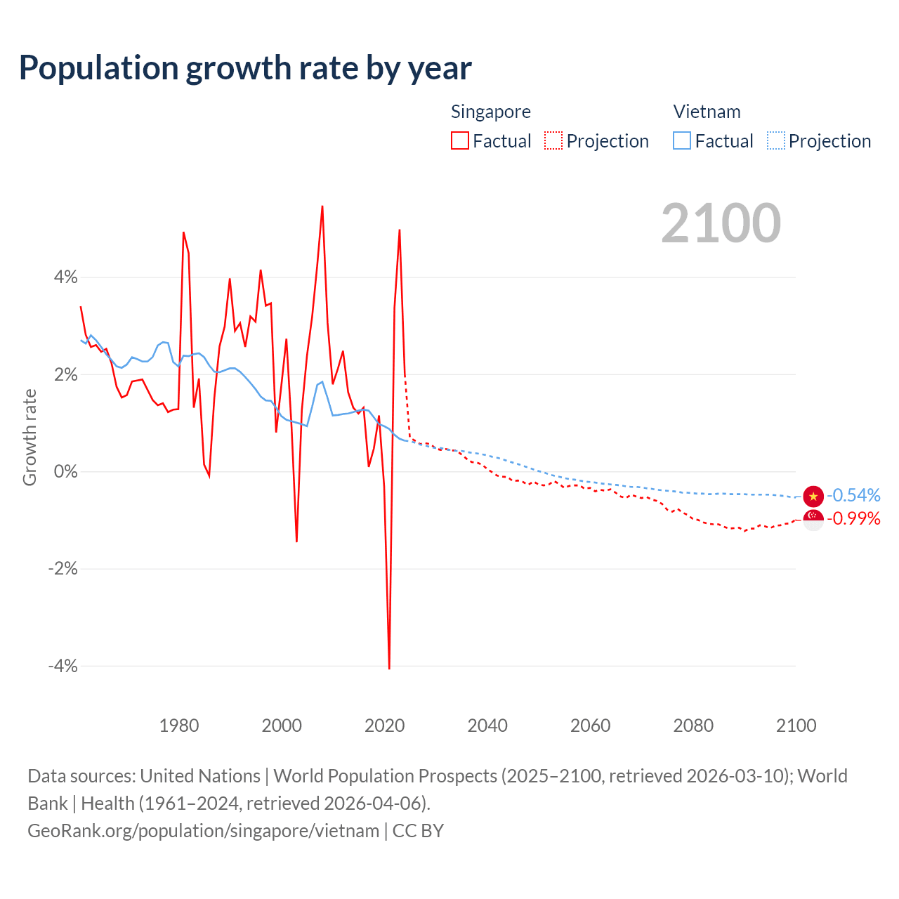 - For the last 10 years, Singapore has had an average growth rate of +1.04% per year vs +0.99% in Vietnam.
