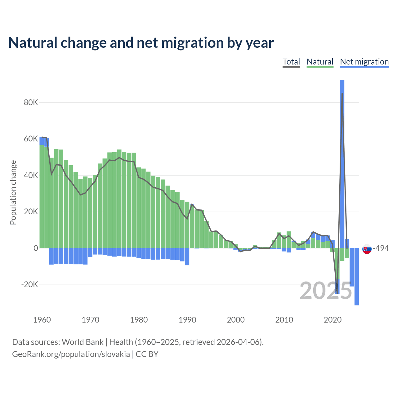 Over the last 10 years, 7.47% of the population change in Slovakia is from natural causes (a loss of 8,728 people) and 92.5% is from migration (a gain of 108,156 people).