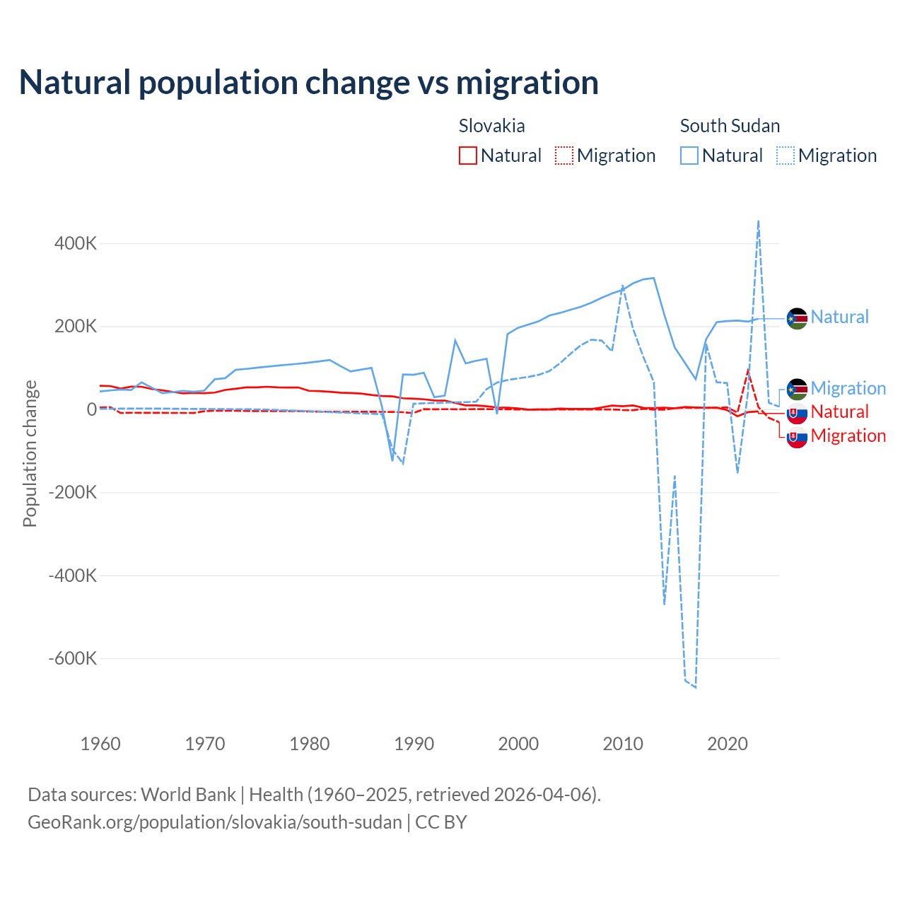 Over the last 10 years, 7.47% of the population change in Slovakia is from natural causes (a loss of 8,728 people) and 92.5% is from migration (a gain of 108,156 people). In South Sudan 57.4% is from natural causes (a gain of 1,792,135 people) and 42.6% is from migration (a loss of 1,329,606 people).