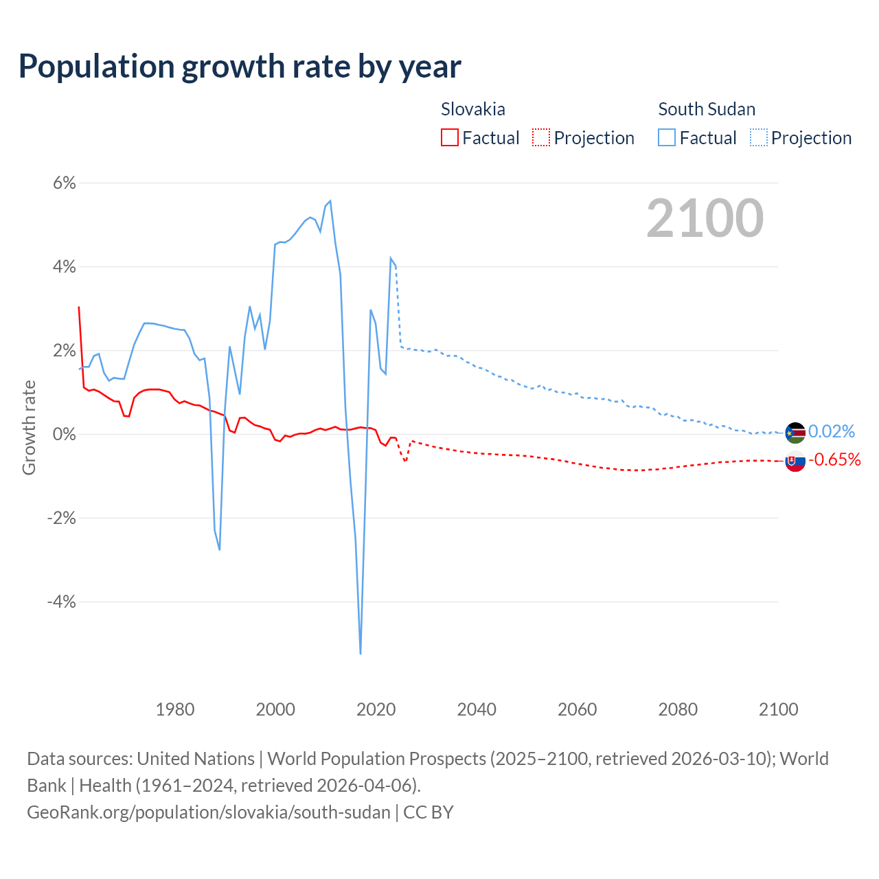 - For the last 10 years, Slovakia has had an average growth rate of +0.01% per year vs +0.65% in South Sudan.