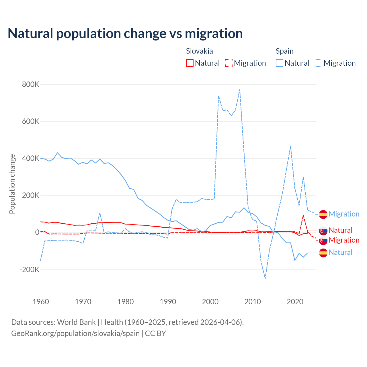 Over the last 10 years, 7.47% of the population change in Slovakia is from natural causes (a loss of 8,728 people) and 92.5% is from migration (a gain of 108,156 people). In Spain 25.8% is from natural causes (a loss of 627,829 people) and 74.2% is from migration (a gain of 1,810,127 people).