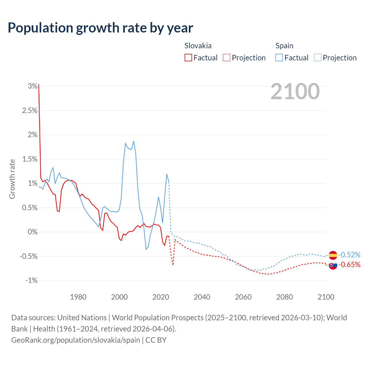 - For the last 10 years, Slovakia has had an average growth rate of +0.01% per year vs +0.43% in Spain.