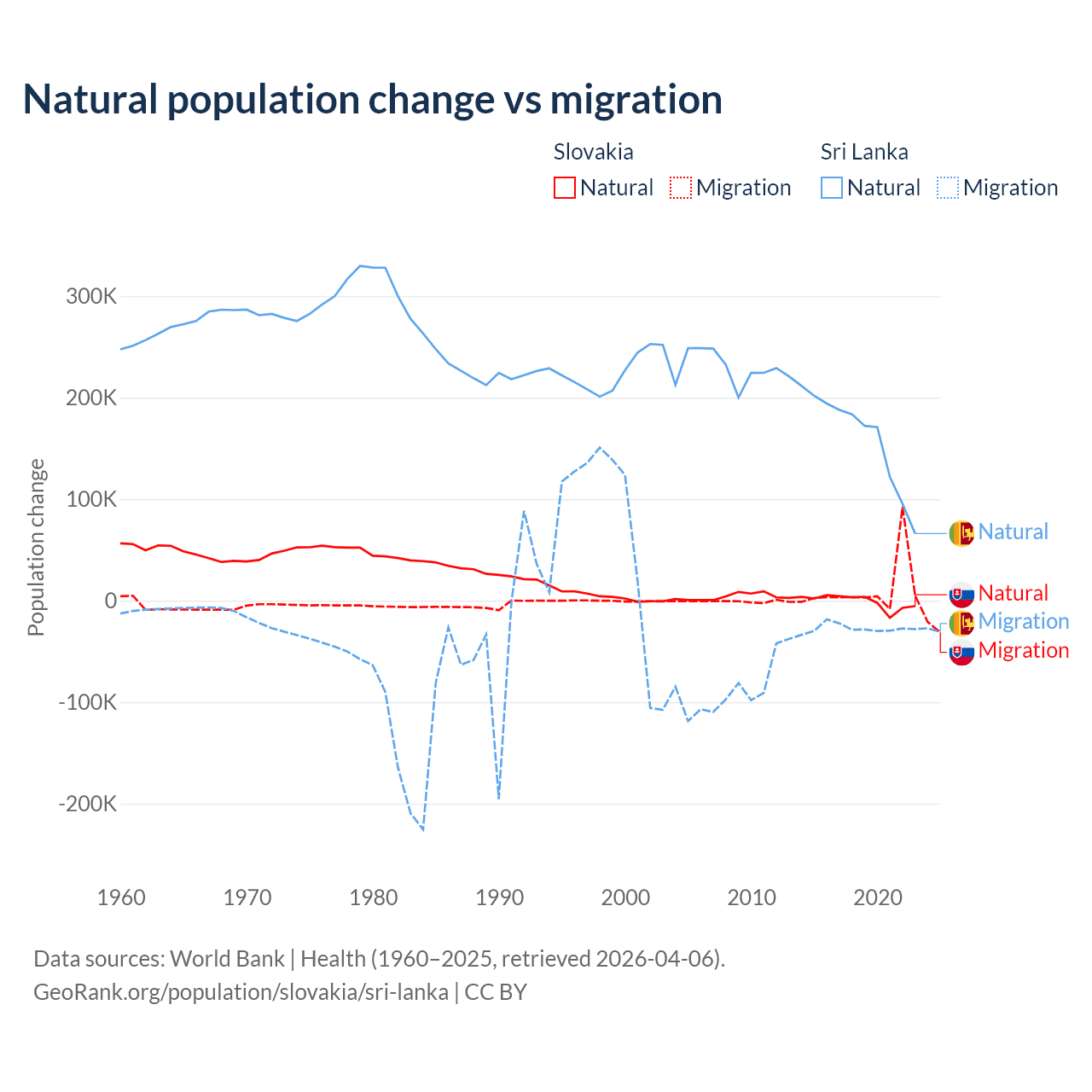 Over the last 10 years, 7.47% of the population change in Slovakia is from natural causes (a loss of 8,728 people) and 92.5% is from migration (a gain of 108,156 people). In Sri Lanka 85.3% is from natural causes (a gain of 1,605,749 people) and 14.7% is from migration (a loss of 276,121 people).