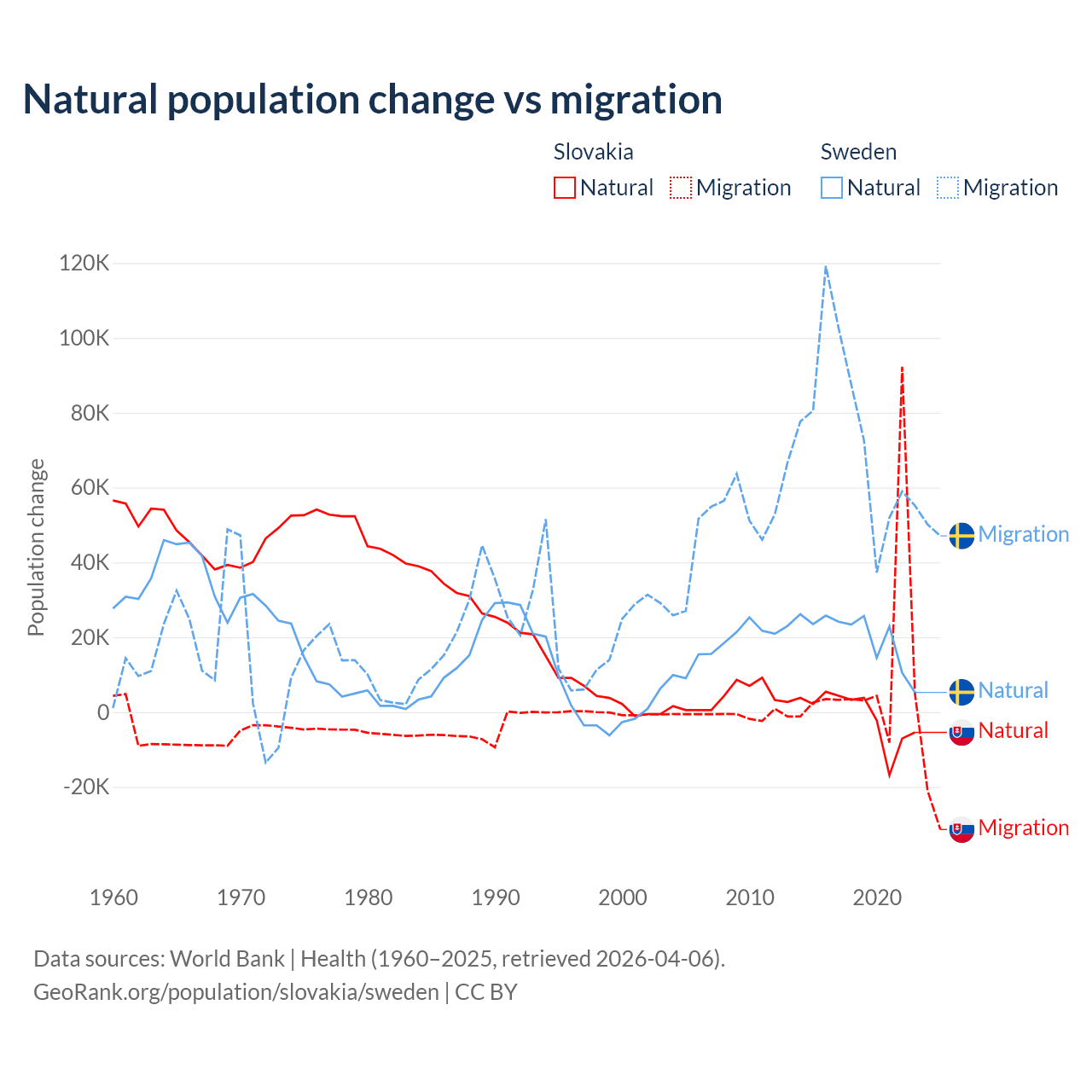 Over the last 10 years, 7.47% of the population change in Slovakia is from natural causes (a loss of 8,728 people) and 92.5% is from migration (a gain of 108,156 people). In Sweden 21.4% is from natural causes (a gain of 201,900 people) and 78.6% is from migration (a gain of 743,642 people).